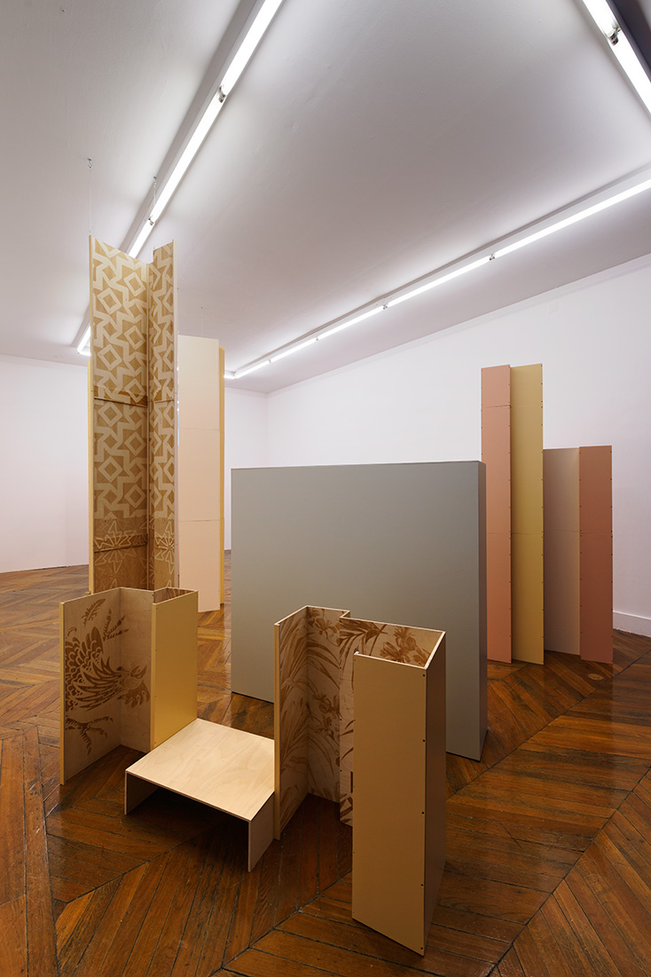 the reverse sides are given over to hybrid patterns inspired by the clothing (brands, textile motifs, etc.) worn by the users of a colourful, socially mixed neighbourhood. Visitors are invited to stroll through the installation as if it were a theatre stage reflecting the surrounding urban fabric. Taking up one of the walls in the exhibition, an outsize map of Noisy-le-Sec gives visitors the opportunity to project their visions and impressions of the municipality and thus bring change to the standardised representation resorted to by town planning.