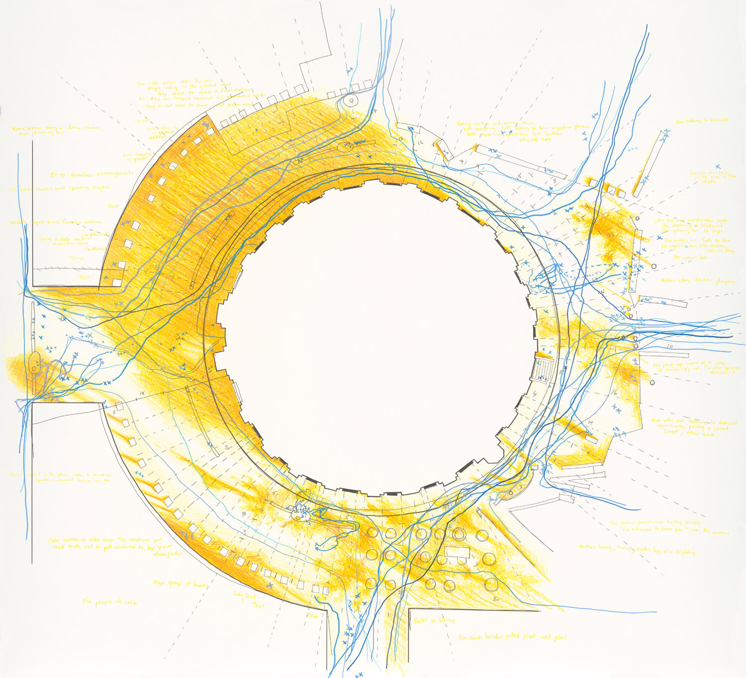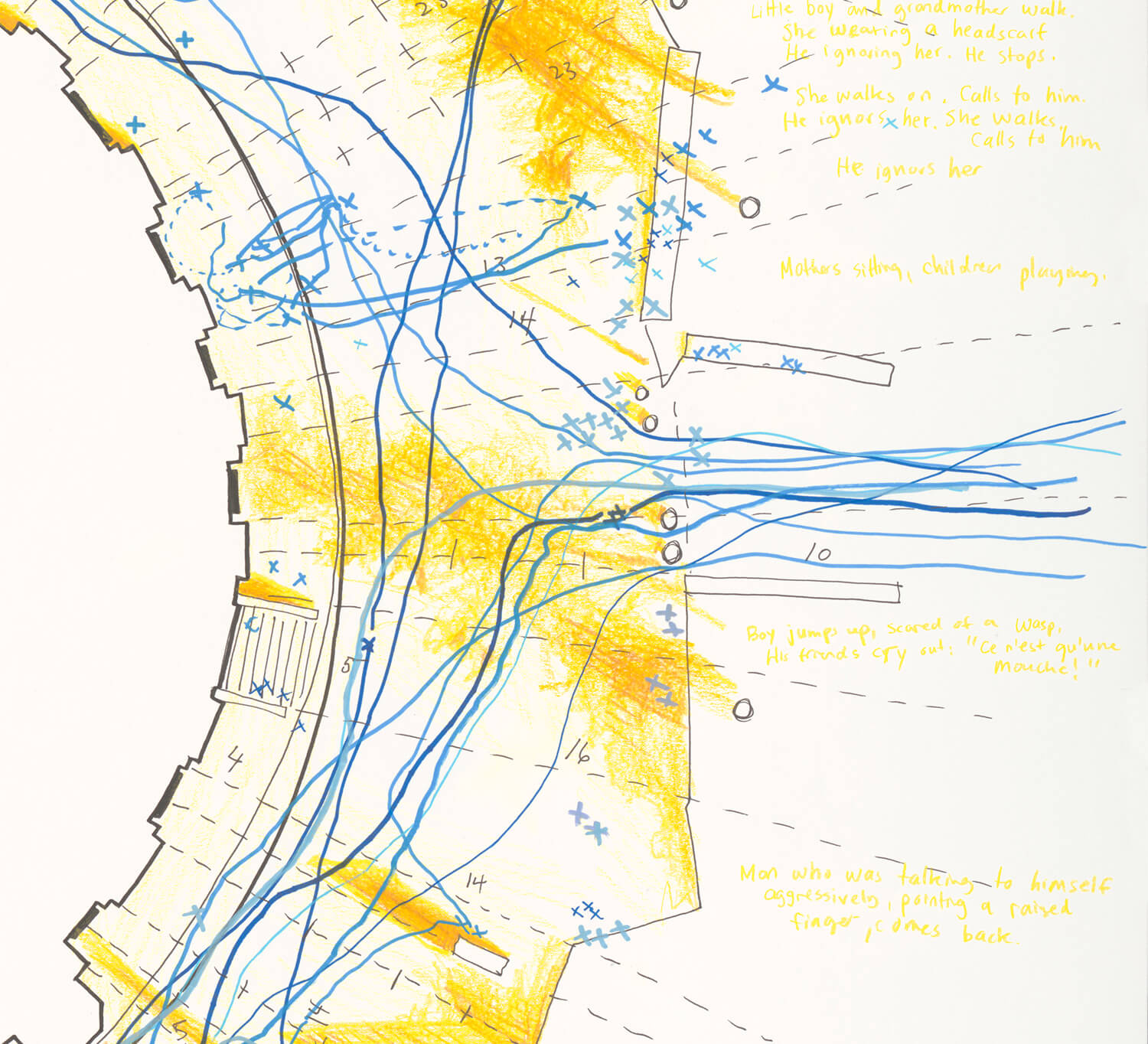 Without relying on a pre-existing architectural plan, Fassler mapped out this urban space by counting her own steps, using them as scaled markers of her body in motion. She traced the paths taken by pedestrians in blue or red pen, marking stops with crosses. Shadows, rendered in shades of blue, beige, and warm yellow, evoke the intense heat and bright dazzling light of those days. Central themes of the eye, the sun, orbit, and eclipse are amplified by wallpaper behind the drawings, reproducing an interior view of the glass roof of the Bourse de Commerce.