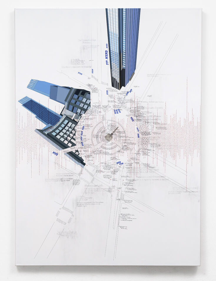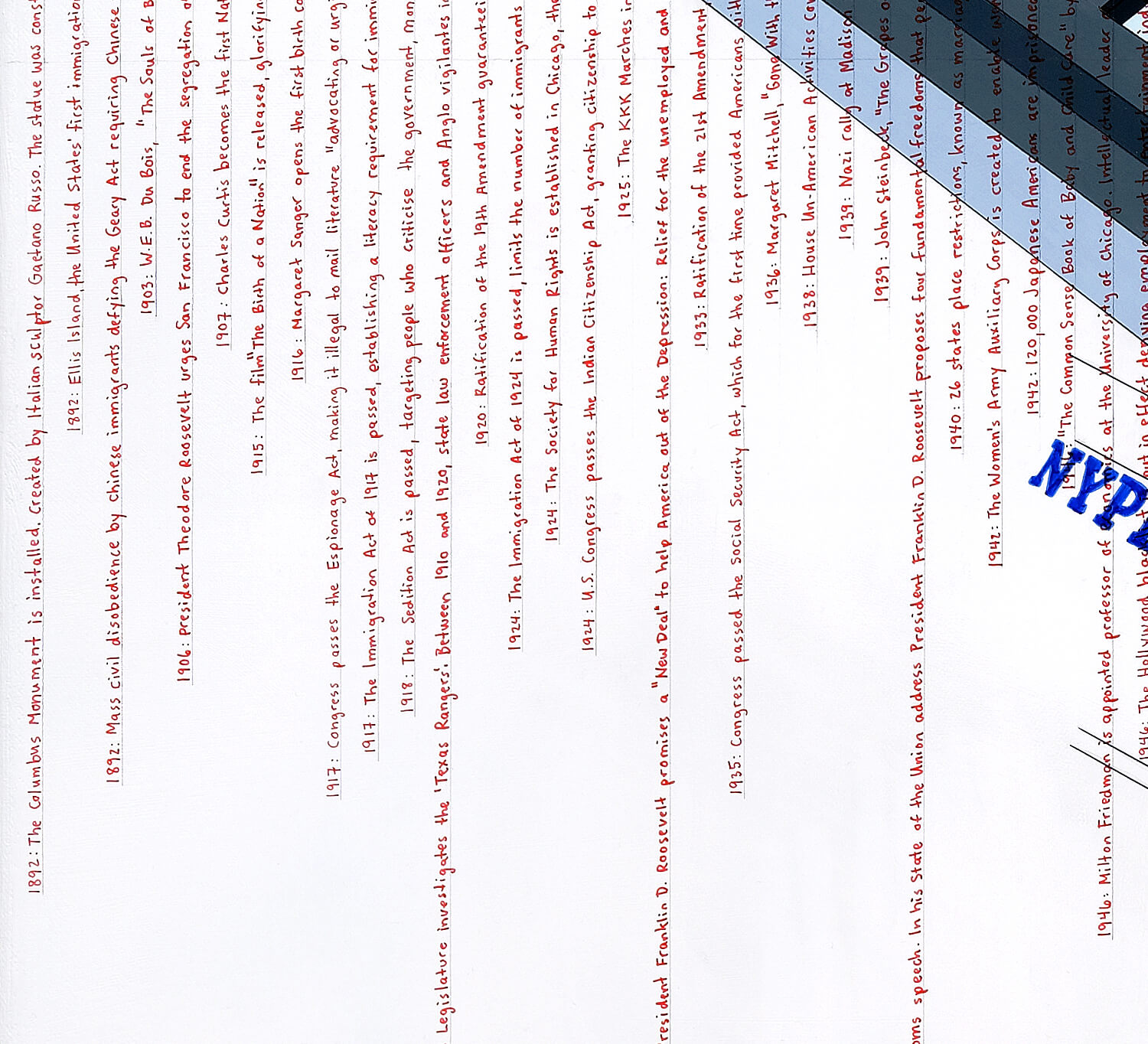 In 2020, the work was reworked to include a timeline of US events, running from left to right, from the construction of the Columbus statue in 1892 to September 2020. Comprising 140 moments in US history, the timeline traces shifts in power, highlighting when dominant narratives have been established, challenged or rewritten. It charts a history of empowerment and disempowerment, reflecting the formation of US national identity and the country’s contested collective past.