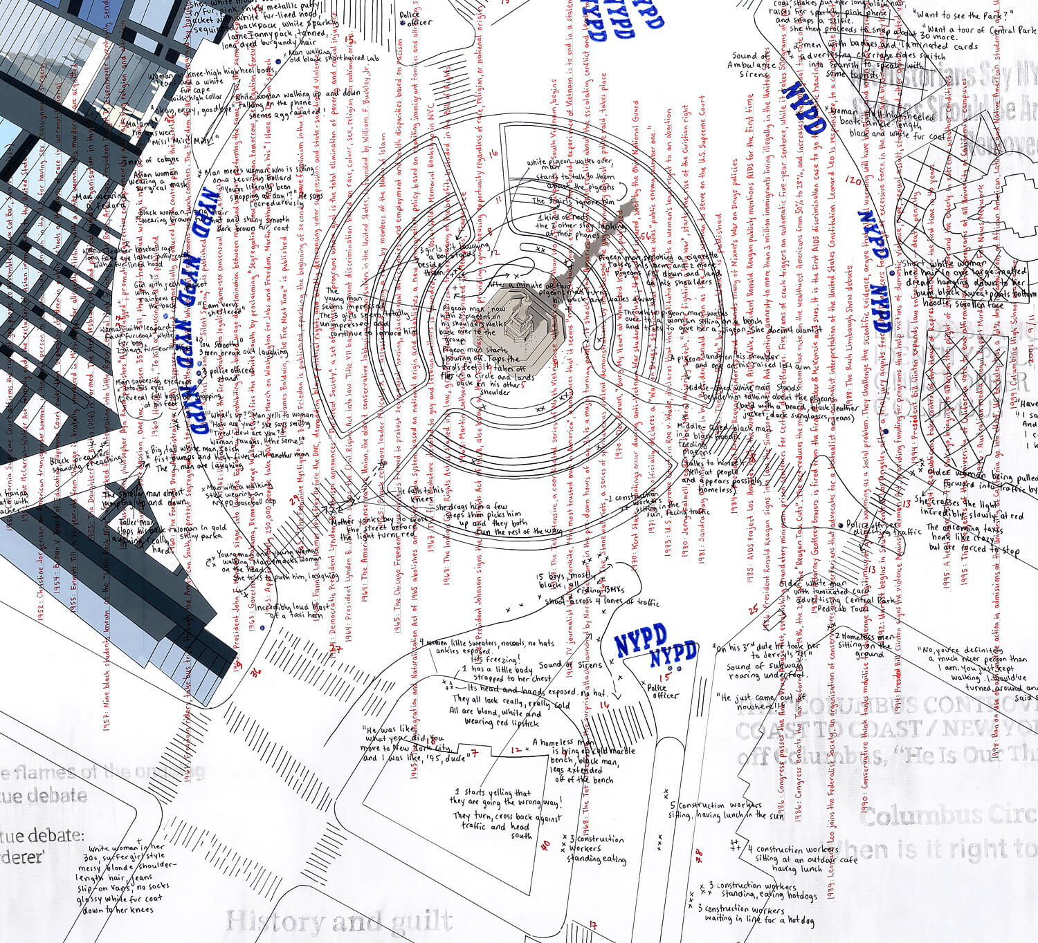At the centre of New York City, within an iconic traffic circle named for him, Christopher Columbus stands flanked by the Time Warner Center and the Trump International Hotel & Tower. This public site and its monument occupy a prominent position in ongoing debates around the memorialisation of historical figures, the examination of the contexts from which they emerge, and the question of their continued presence or removal. Against this backdrop, the work attends to everyday moments of life unfolding in the shadow of the monument, scenes that are mundane, absurd, humorous, lonely, dubious and spectacular, and inseparable from the larger debate that surrounds them.