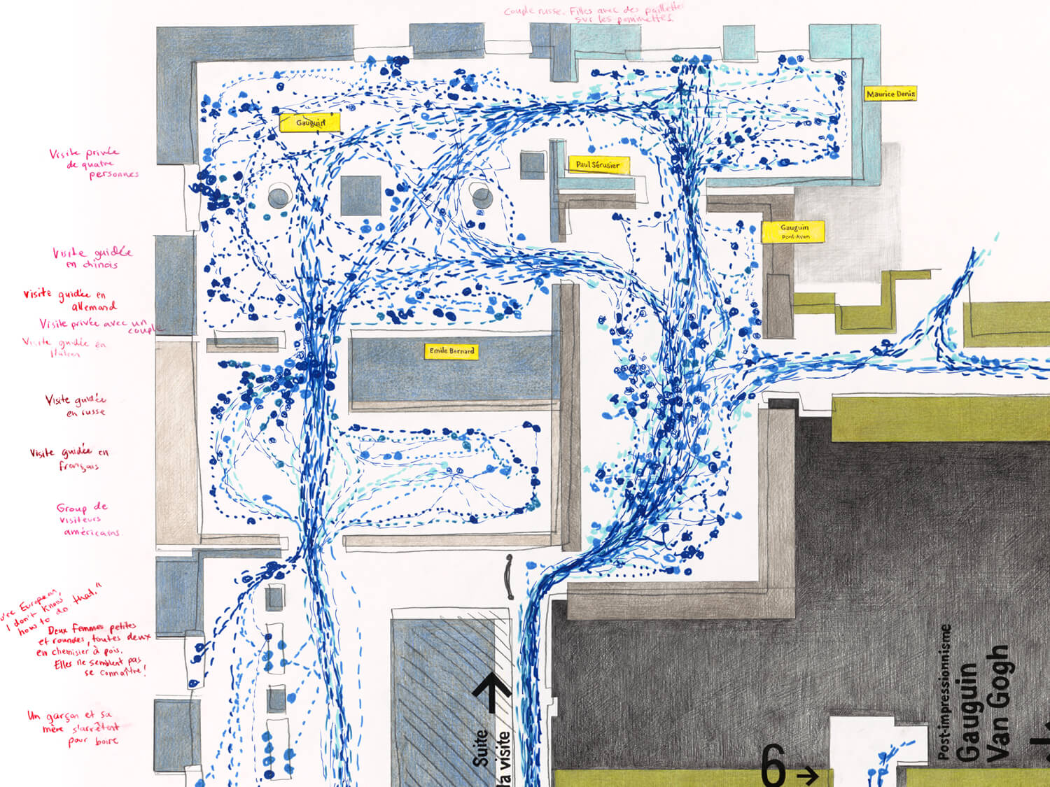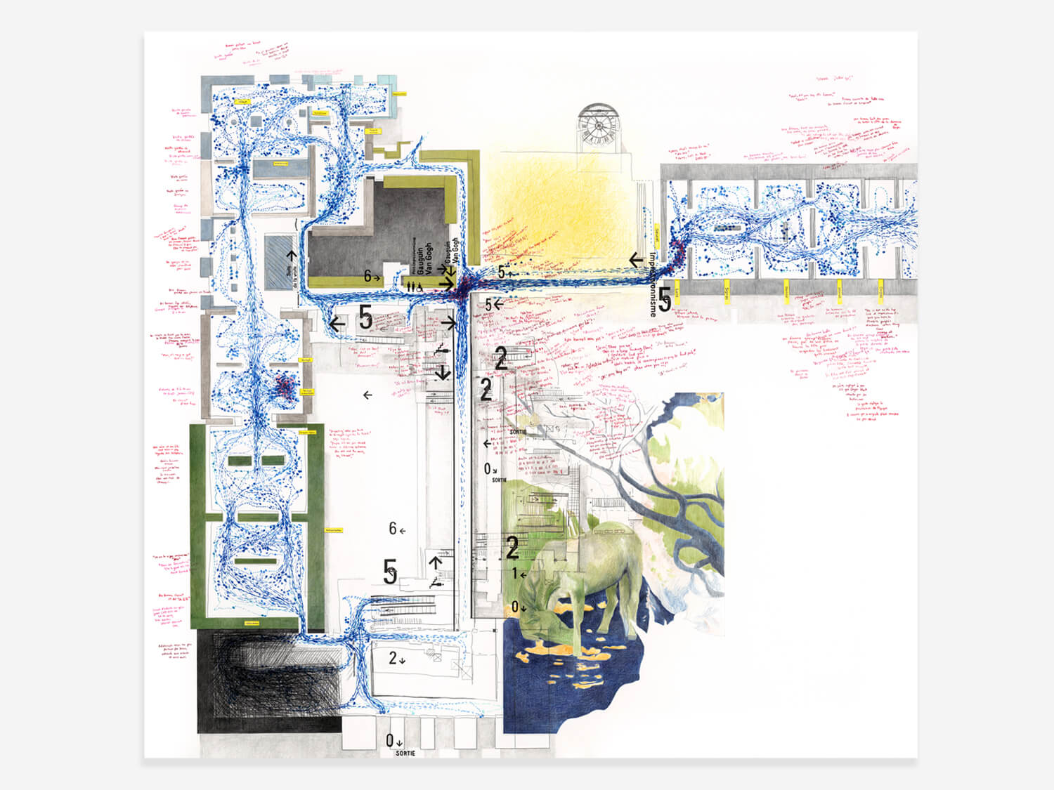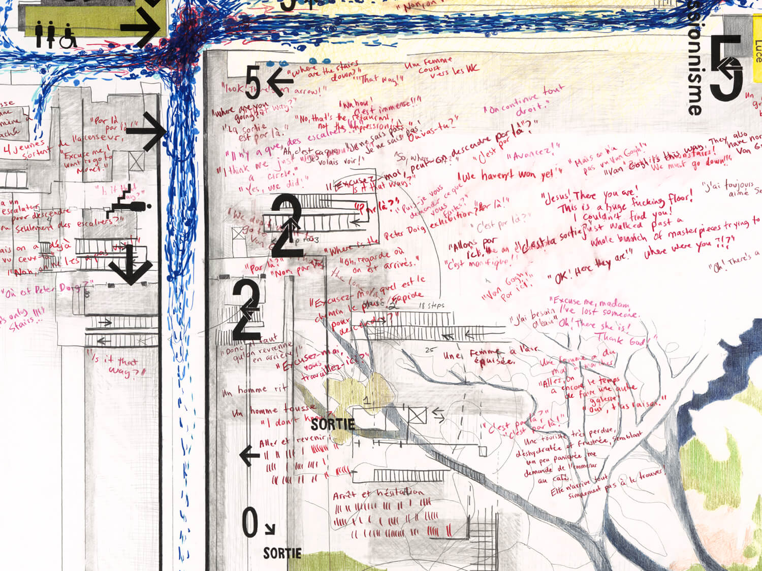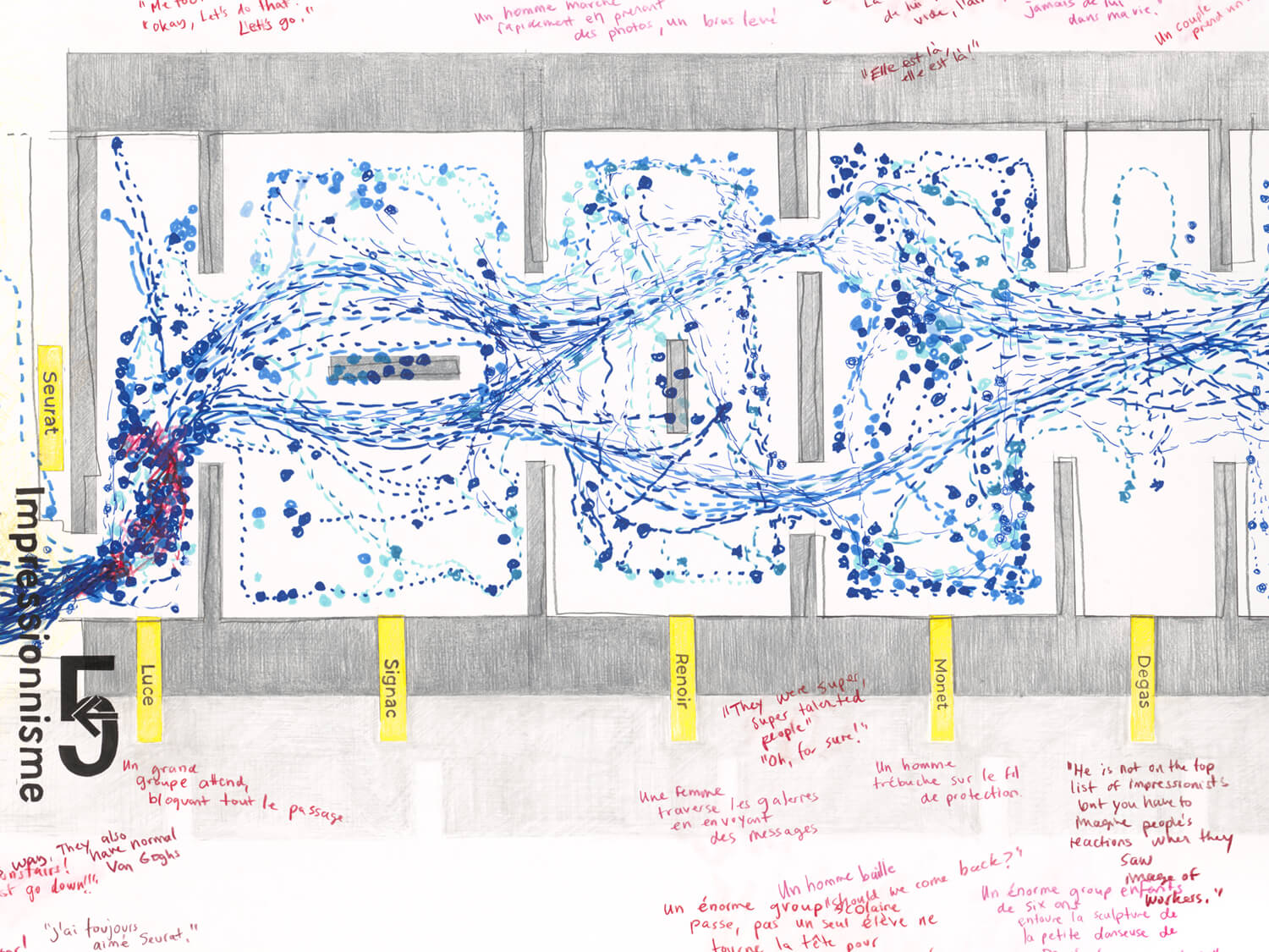 Dress the Monster with Ornaments: Level 5 focuses on the fifth floor of the Musée d’Orsay, which houses the Impressionist and Post-Impressionist collections. As with the rest of the project, I visited the museum daily, tracing visitor movement through the galleries and recording moments of pause, congestion, and disorientation. The drawing is threaded with fragments of overheard conversation, many of which express confusion, impatience, or the difficulty of navigating a space shaped by crowds, expectation, and fame.