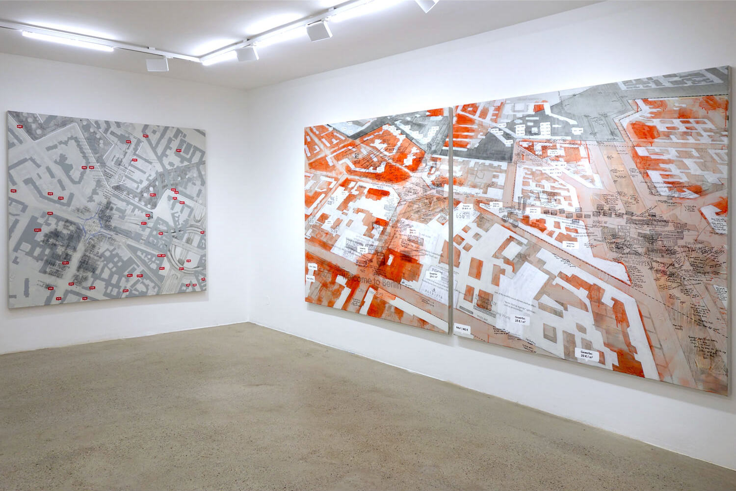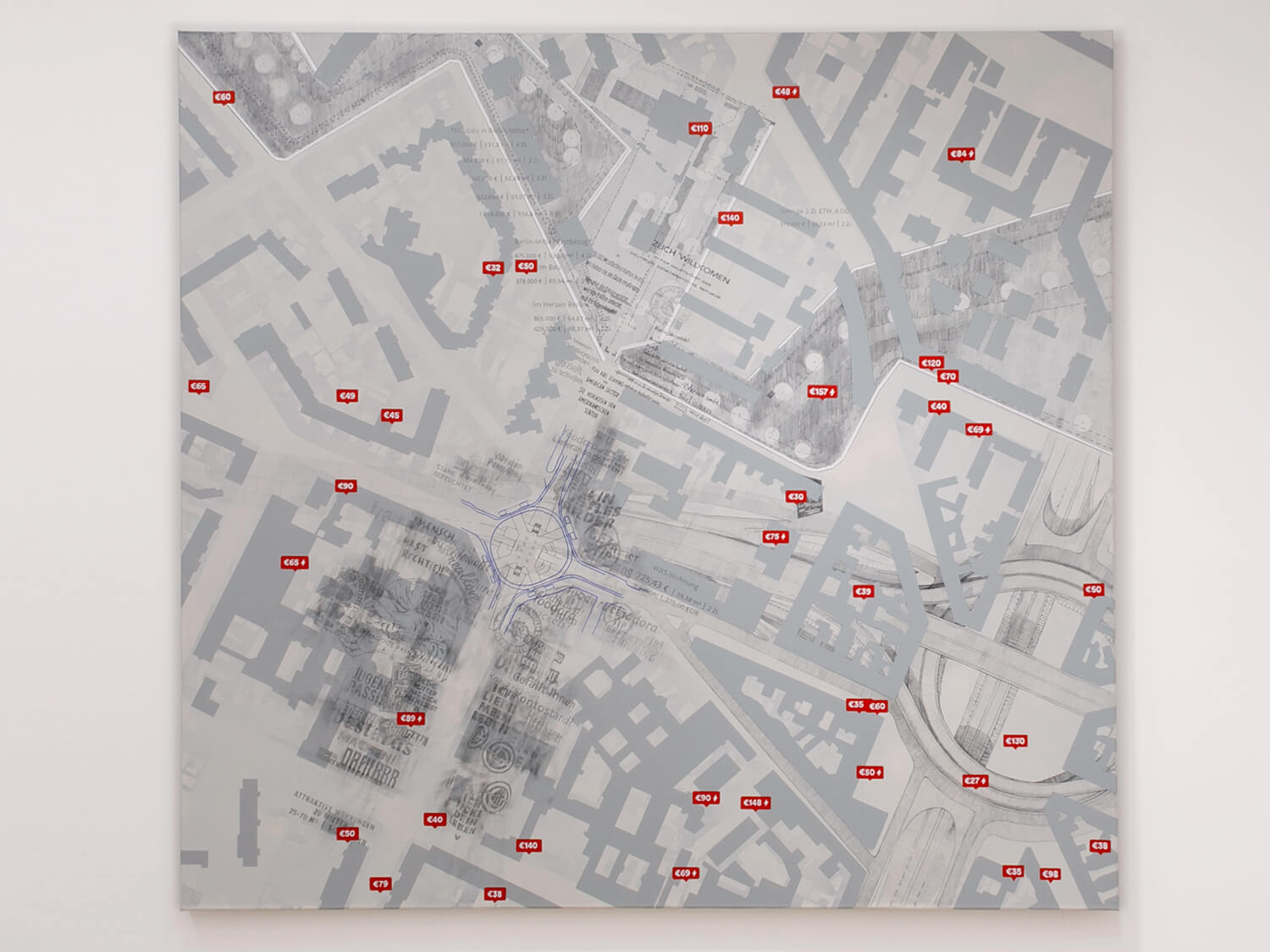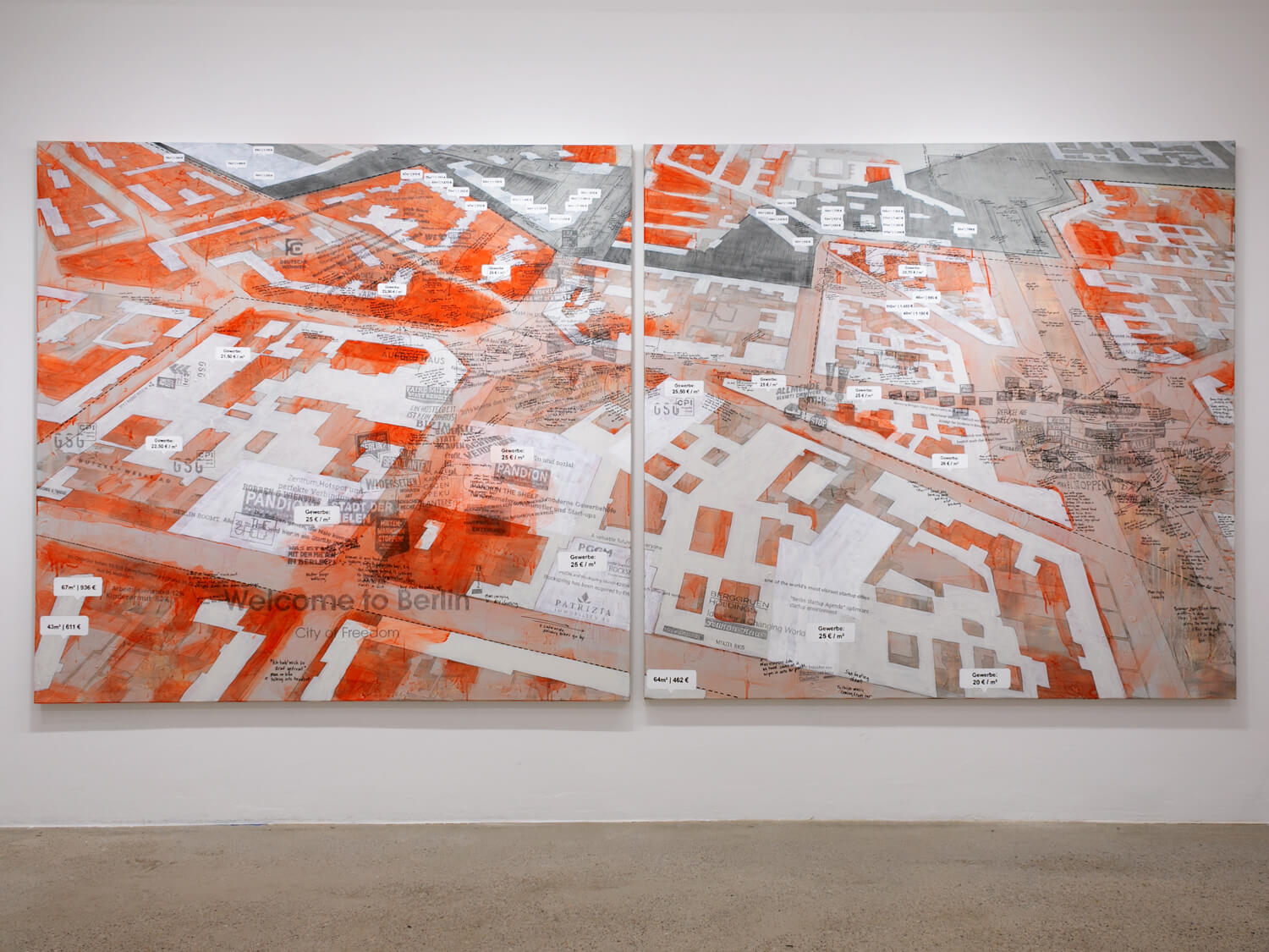 For the Berlin Art Prize exhibition at SMAC, this body of work brings a long-term engagement with contested public space into the gallery through two large-scale paintings and a billboard installation that fills the room, nearly touching the ceiling and walls. Rooted in the layered histories of Moritzplatz, a site shaped by war, division, community, displacement, and rapid gentrification, the works emerge from sustained walking, archival mapping, and extended observation. Together, they trace urban transformation from pre-war Berlin footprints to the pressures of today’s housing market.