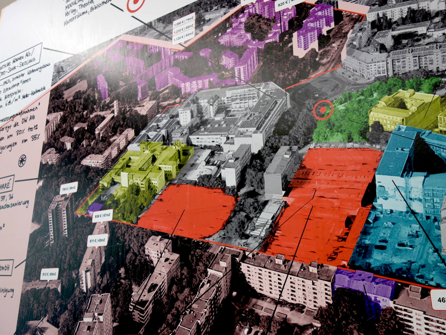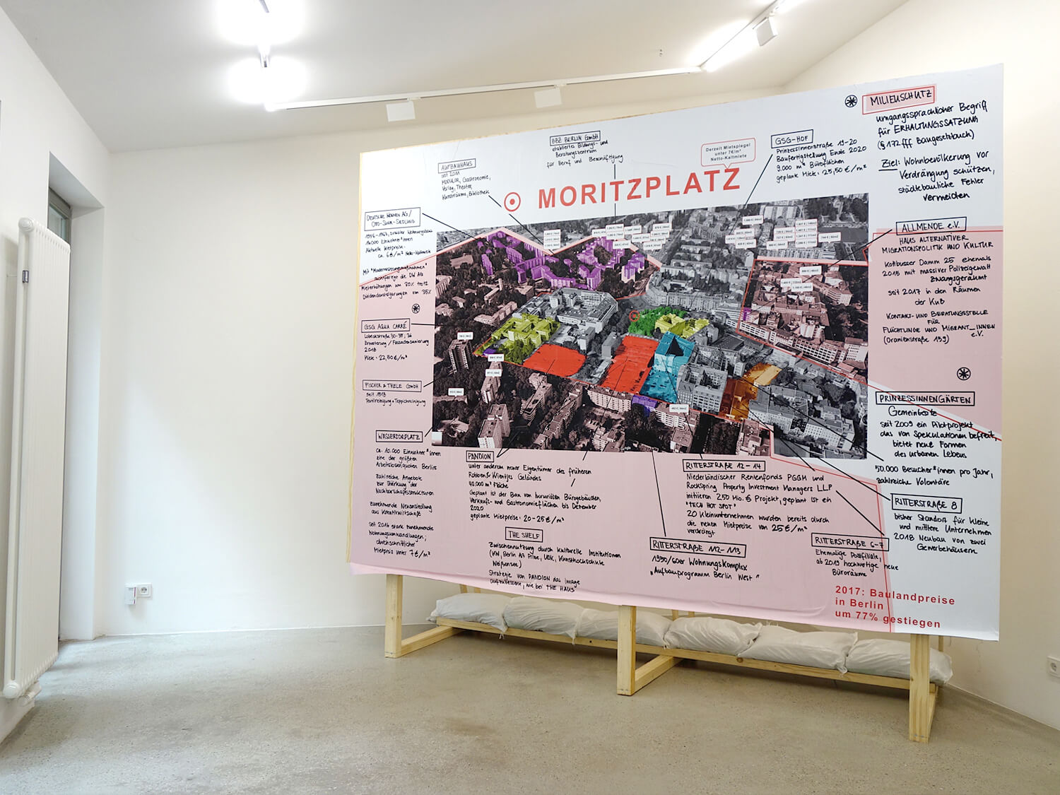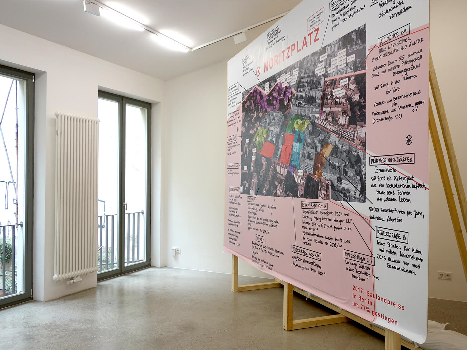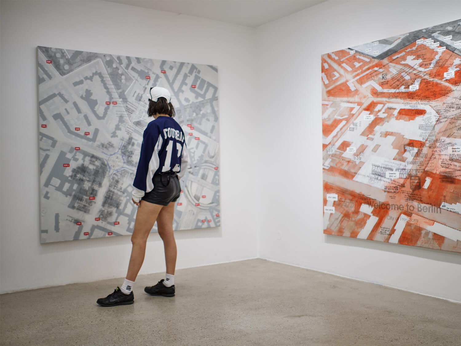 For the Berlin Art Prize exhibition at SMAC, this body of work brings a long-term engagement with contested public space into the gallery through two large-scale paintings and a billboard installation that fills the room, nearly touching the ceiling and walls. Rooted in the layered histories of Moritzplatz, a site shaped by war, division, community, displacement, and rapid gentrification, the works emerge from sustained walking, archival mapping, and extended observation. Together, they trace urban transformation from pre-war Berlin footprints to the pressures of today’s housing market.