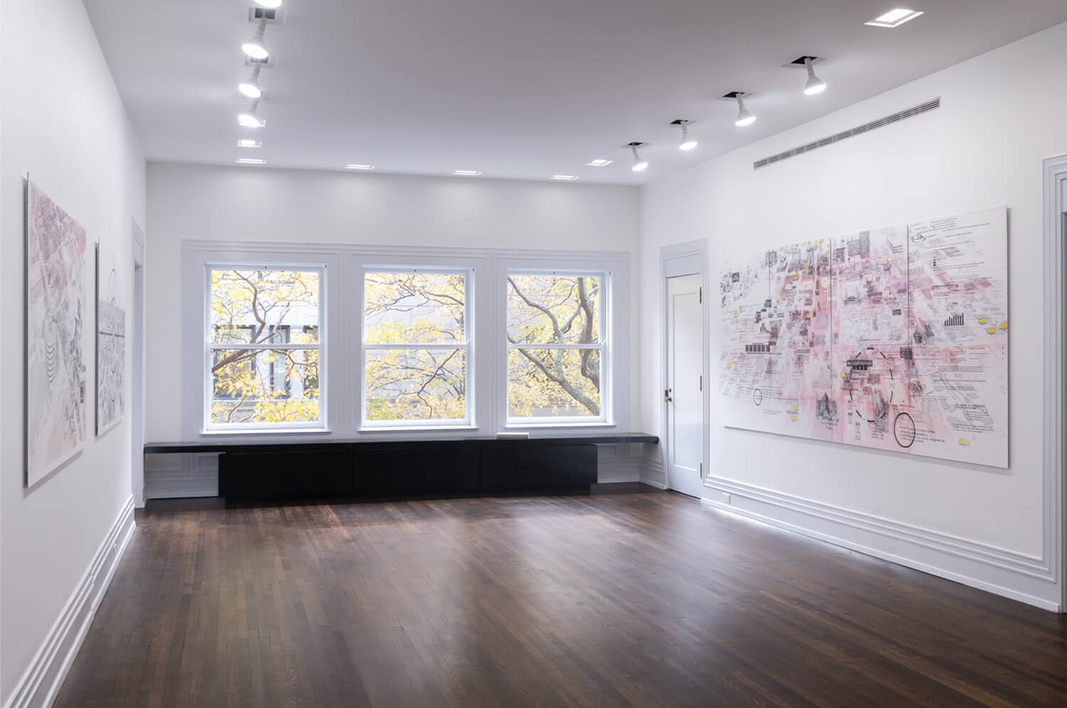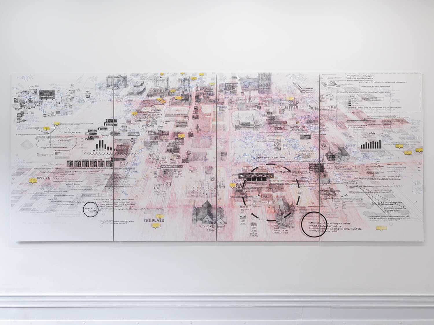 Larissa Fassler’s large-scale diagrammatic drawings focus on society’s failure to assist people who are at the margins: the unhoused, people living below the poverty line, and, in this particular case, those also impacted by the opioid crisis. These works make the routes to poverty visible. They mirror hard images of a community back to itself. The facts are known—statistics for poverty, opioid use, dropouts, healthcare costs— but it is a call to action to highlight them all in one place. In the case of Manchester, public space is completely dysfunctional due to the dominance of car culture, the scourge of parking lots, poverty, and an opioid crisis that leaves people who are struggling with housing, mental illness, and addiction to languish in parks and transit hubs. Societies suffer without well-designed and maintained public spaces. Well-functioning public space can form a sense of togetherness and foster ongoing relations, it can combat inequality and polarization, and it can encourage everyone to find ways to know and help one another. Fassler’s work strives to make these issues visible, serving as an advocate for the urgent necessity of well-designed and inclusive public spaces.