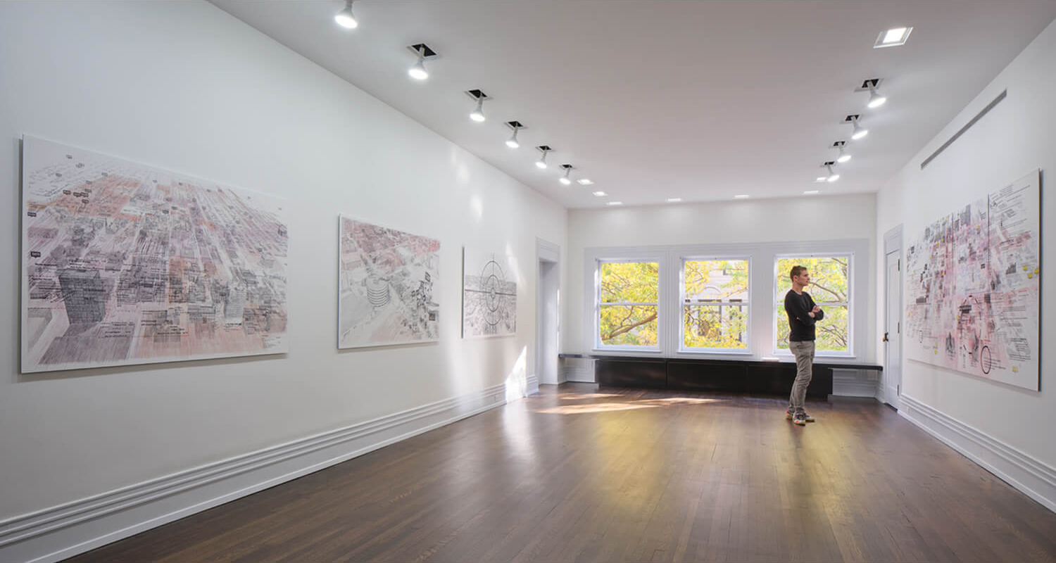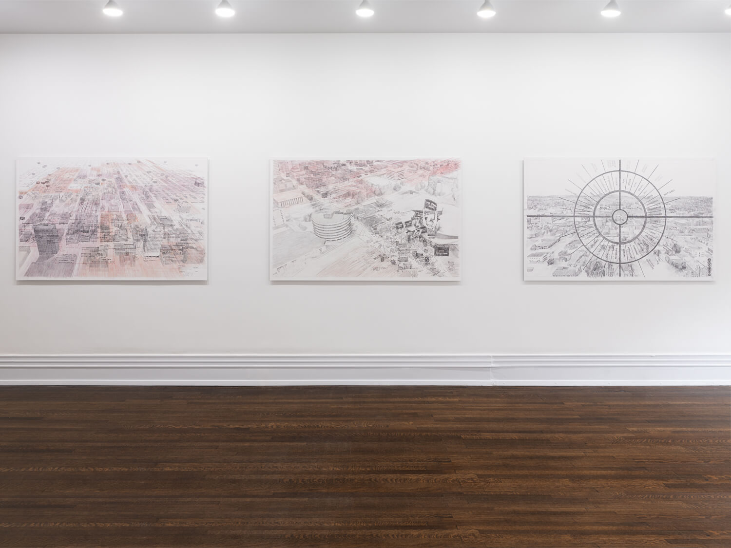 Manchester, NH, USA I-IV was researched while Fassler was artist-in-residence at the Currier Museum of Art. Completed during the residency, the original large-scale drawing series was made with pen, pencil, and colored pencil crayons, and was executed on unmounted paper. The series is now part of the Currier’s permanent collection. Here, facsimile prints are displayed at the scale of the original hand drawings.