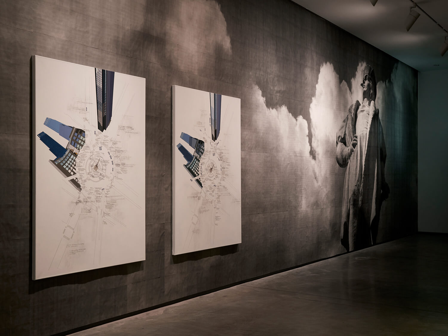 For the exhibition, I presented Columbus Circle, NYC I and II, hung over a large-scale wall work composed of 1,125 A4 laser prints depicting a photograph of Christopher Columbus. Centred on the monument at Columbus Circle in New York City, the works examine everyday scenes unfolding around this contested public site, where debates around historical memorialisation, power and presence surface through moments that are mundane, absurd, humorous and uneasy.
