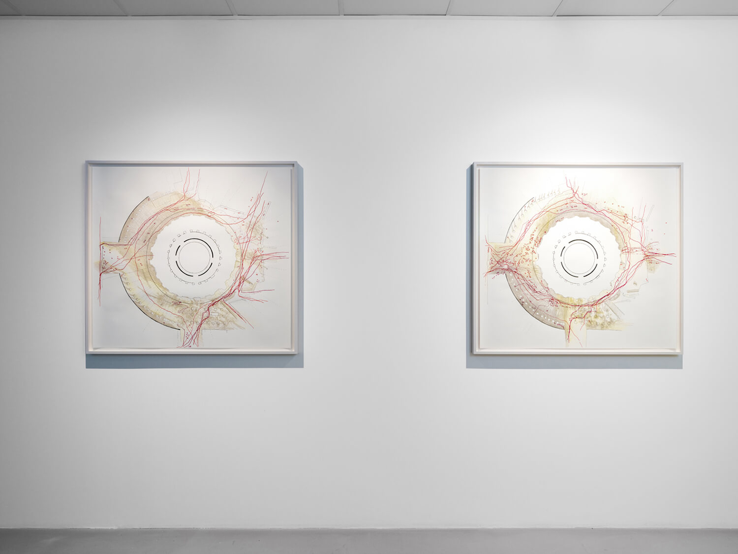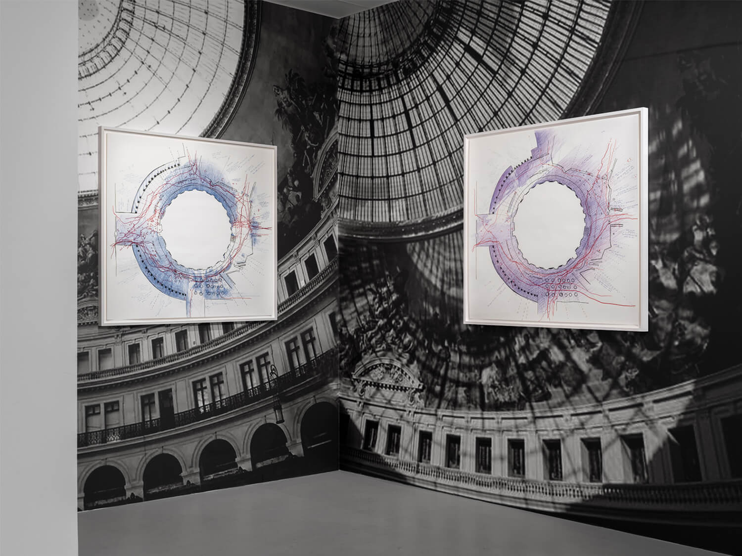 Without relying on a pre-existing architectural plan, Fassler mapped out this urban space by counting her own steps, using them as scaled markers of her body in motion. She traced the paths taken by pedestrians in blue or red pen, marking stops with crosses. Shadows, rendered in shades of blue, beige, and warm yellow, evoke the intense heat and bright dazzling light of those days. Central themes of the eye, the sun, orbit, and eclipse are amplified by wallpaper behind the drawings, reproducing an interior view of the glass roof of the Bourse de Commerce.