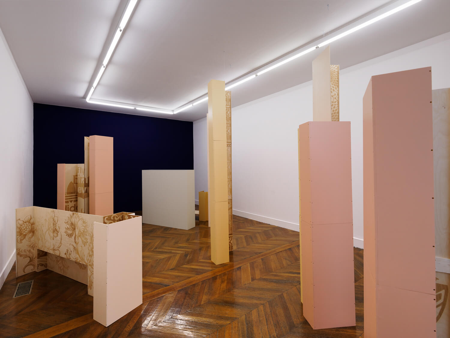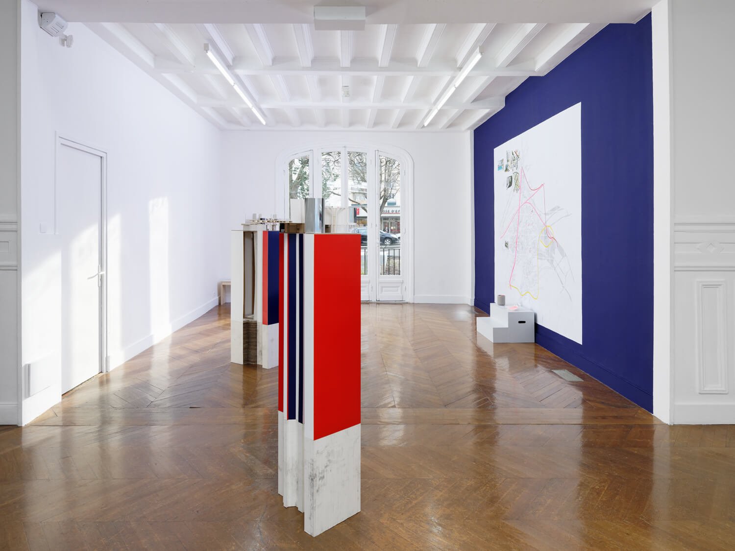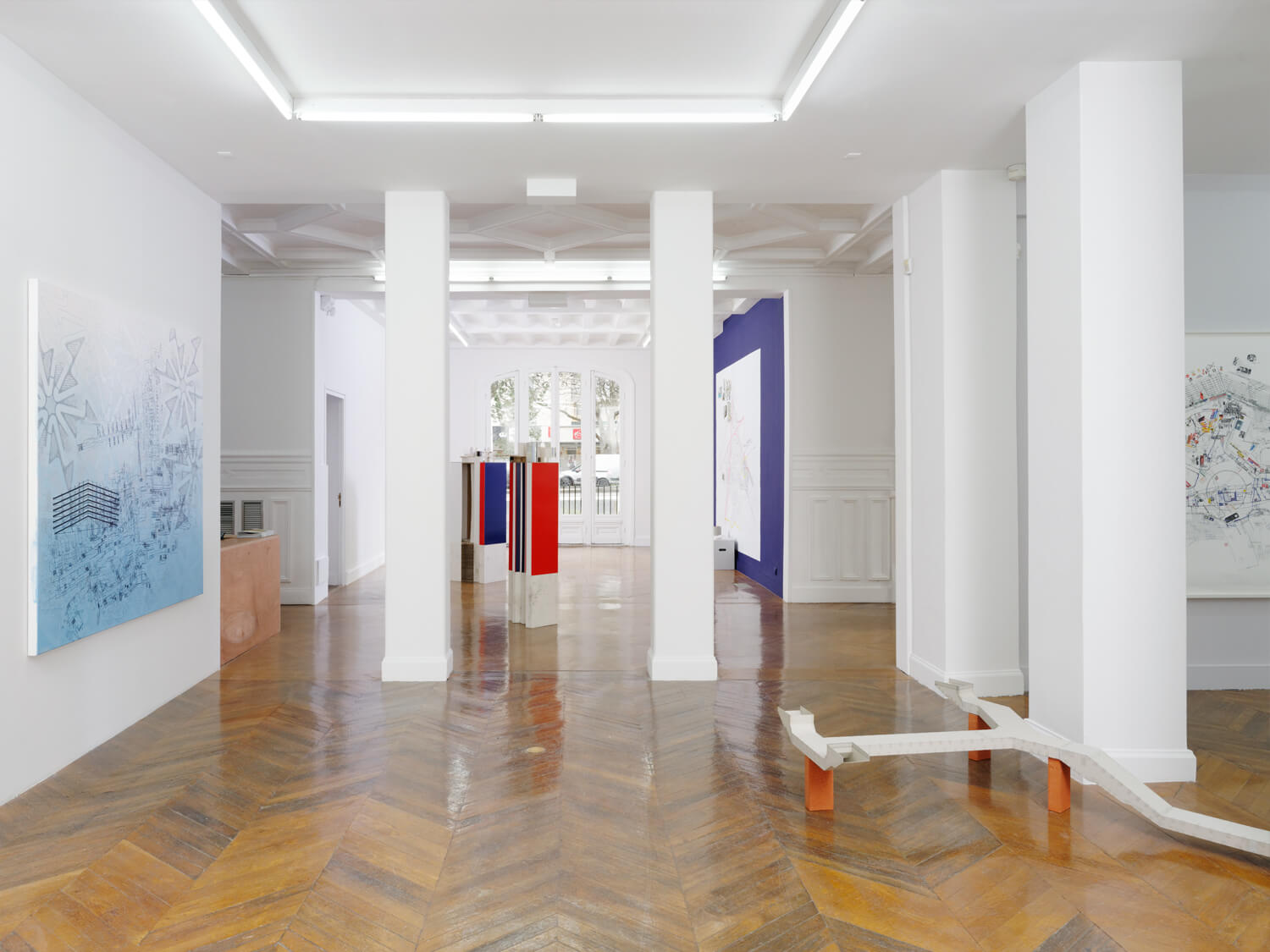Several works were developed during a residency in Noisy-le-Sec and focus on the area surrounding La Galerie, particularly the Esplanade Simone-Veil. A large-scale maquette of the neighbouring tower blocks reproduces the façades of the 1970s buildings, while their reverse sides incorporate patterns derived from local visual cultures. An oversized wall map of Noisy-le-Sec offers an alternative reading of the municipality, countering standardised urban representations.