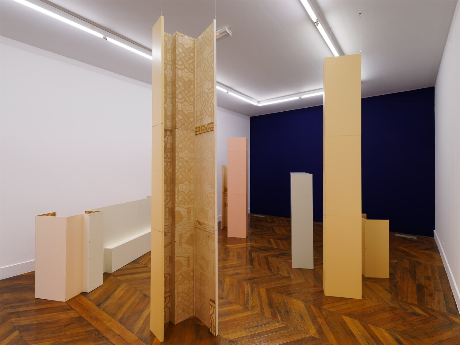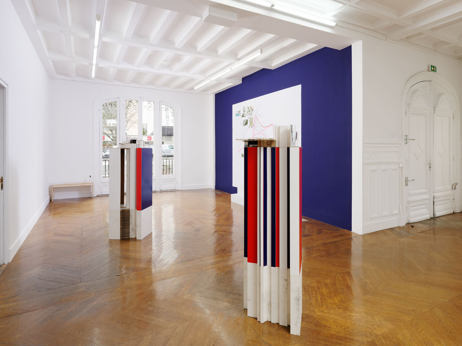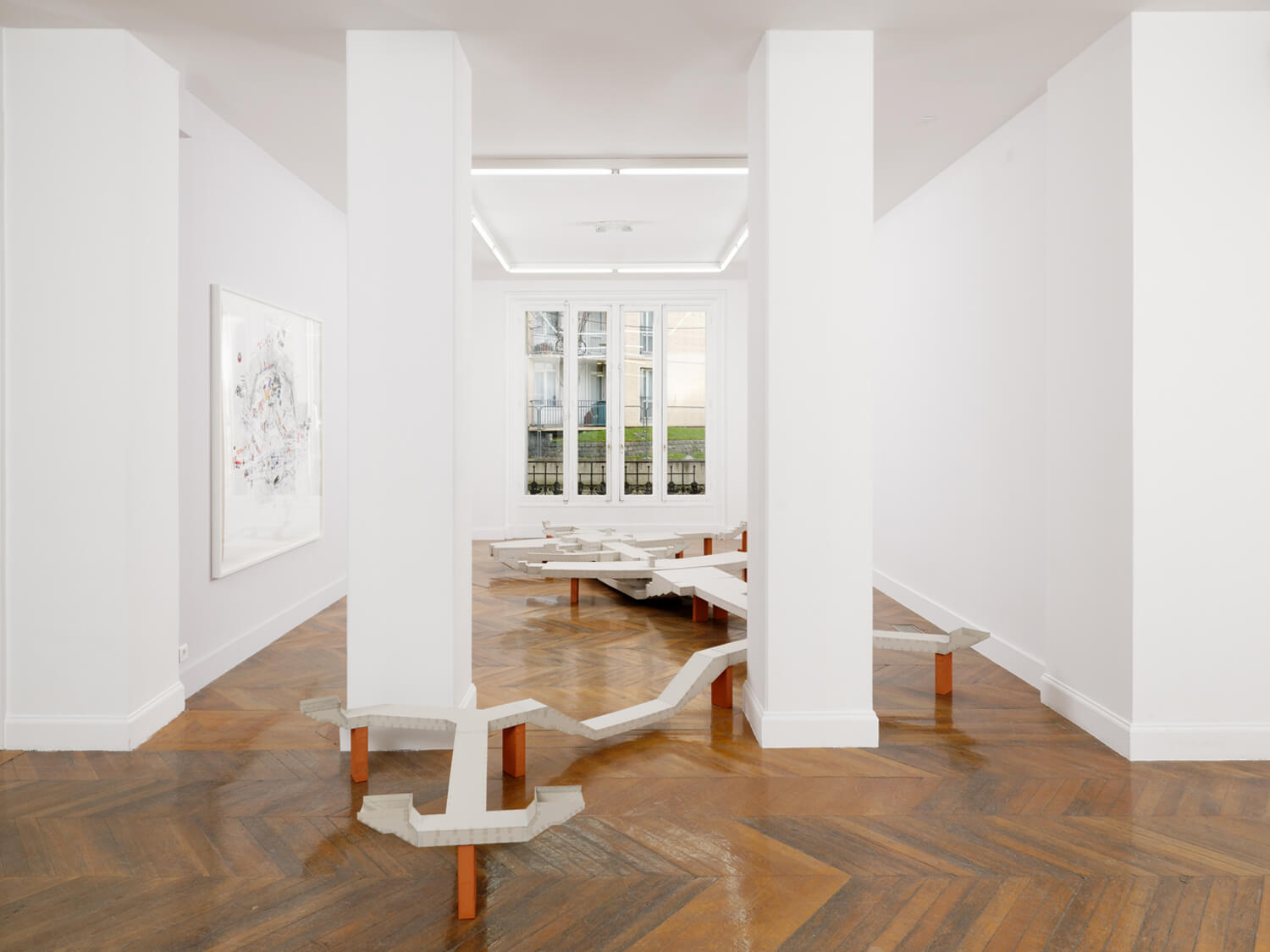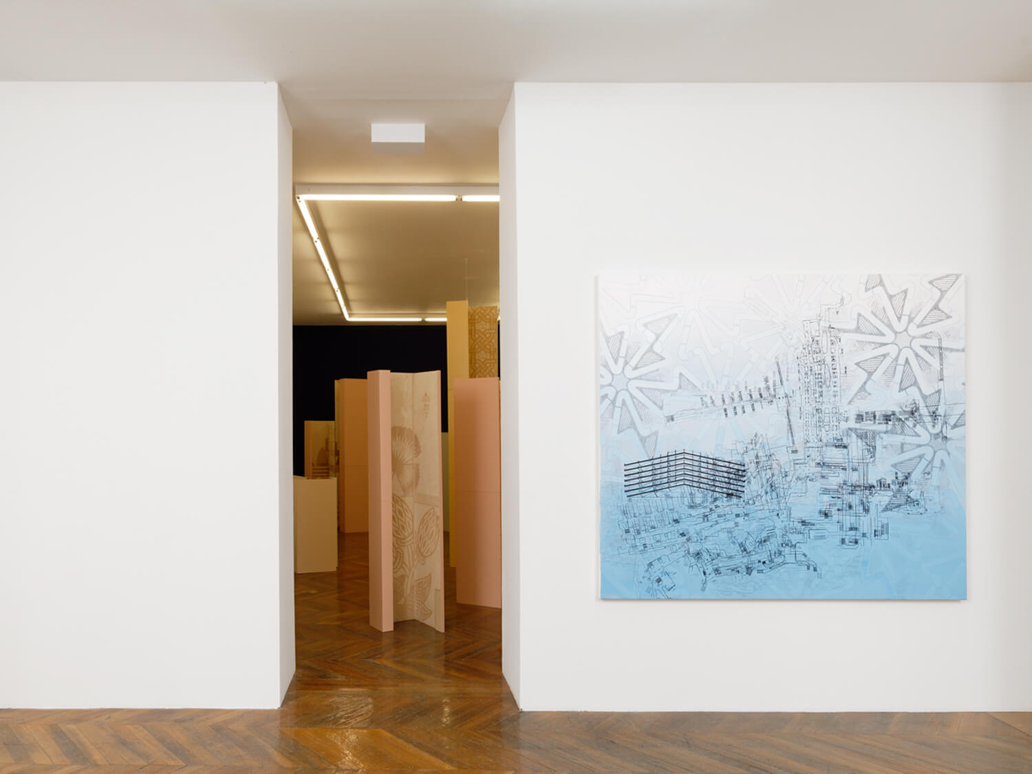 Several works were developed during a residency in Noisy-le-Sec and focus on the area surrounding La Galerie, particularly the Esplanade Simone-Veil. A large-scale maquette of the neighbouring tower blocks reproduces the façades of the 1970s buildings, while their reverse sides incorporate patterns derived from local visual cultures. An oversized wall map of Noisy-le-Sec offers an alternative reading of the municipality, countering standardised urban representations.