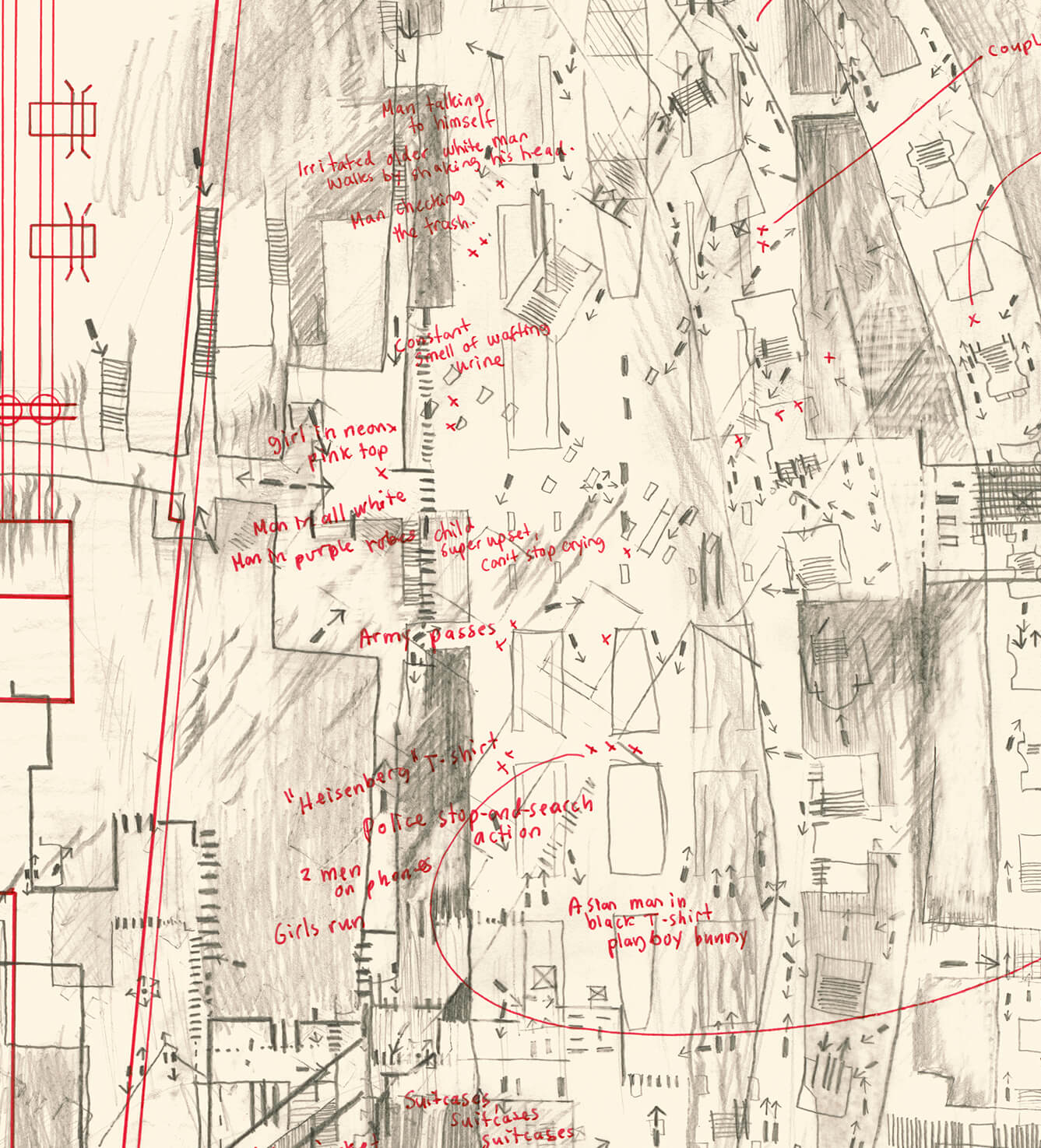 Gare du Nord – La Première Pierre is a series of three drawings examining the architectural development of Paris’s Gare du Nord. Red passages refer to the first station constructed in 1846, which was soon considered inadequate and subsequently relocated to Lille. Five years later, the current station was built on the site.