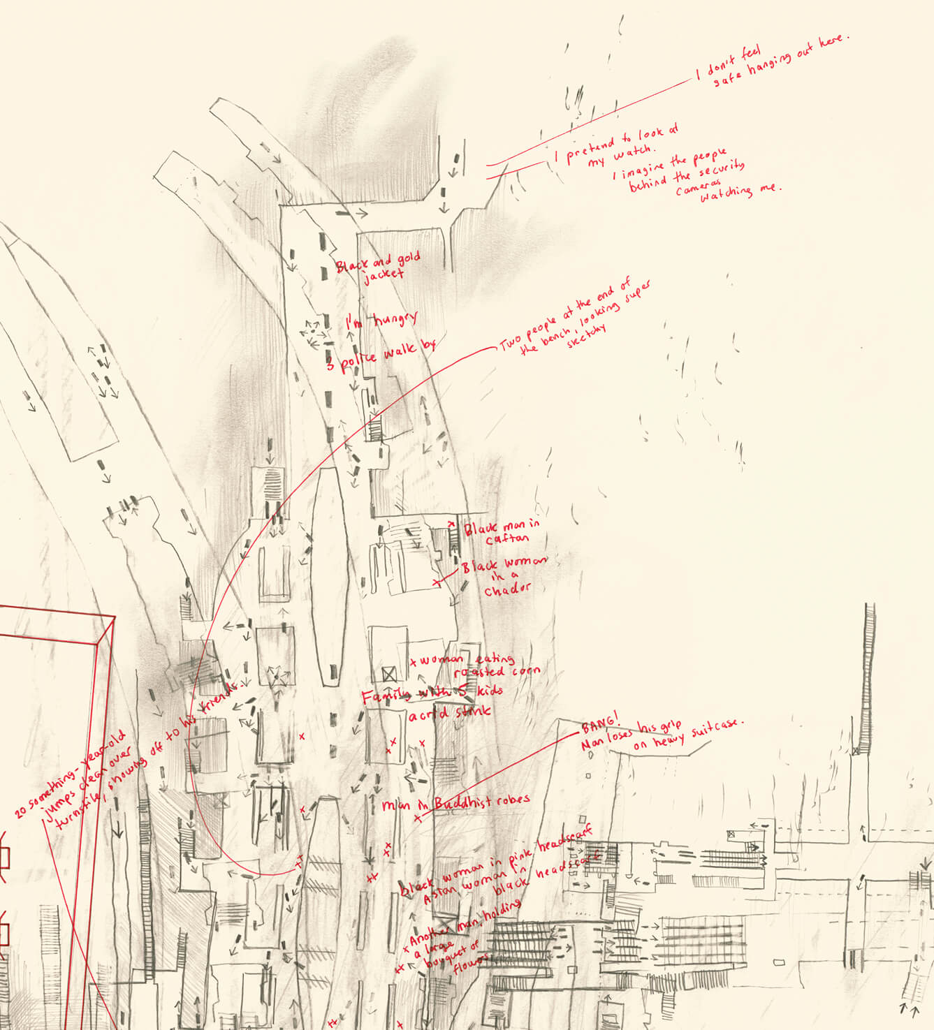 Graphite drawings map the internal spaces of the present-day Gare du Nord, focusing on circulation and spatial structure. The works overlay historical reference and contemporary spatial mapping, using colour and composition to register changes in scale and organisation over time.