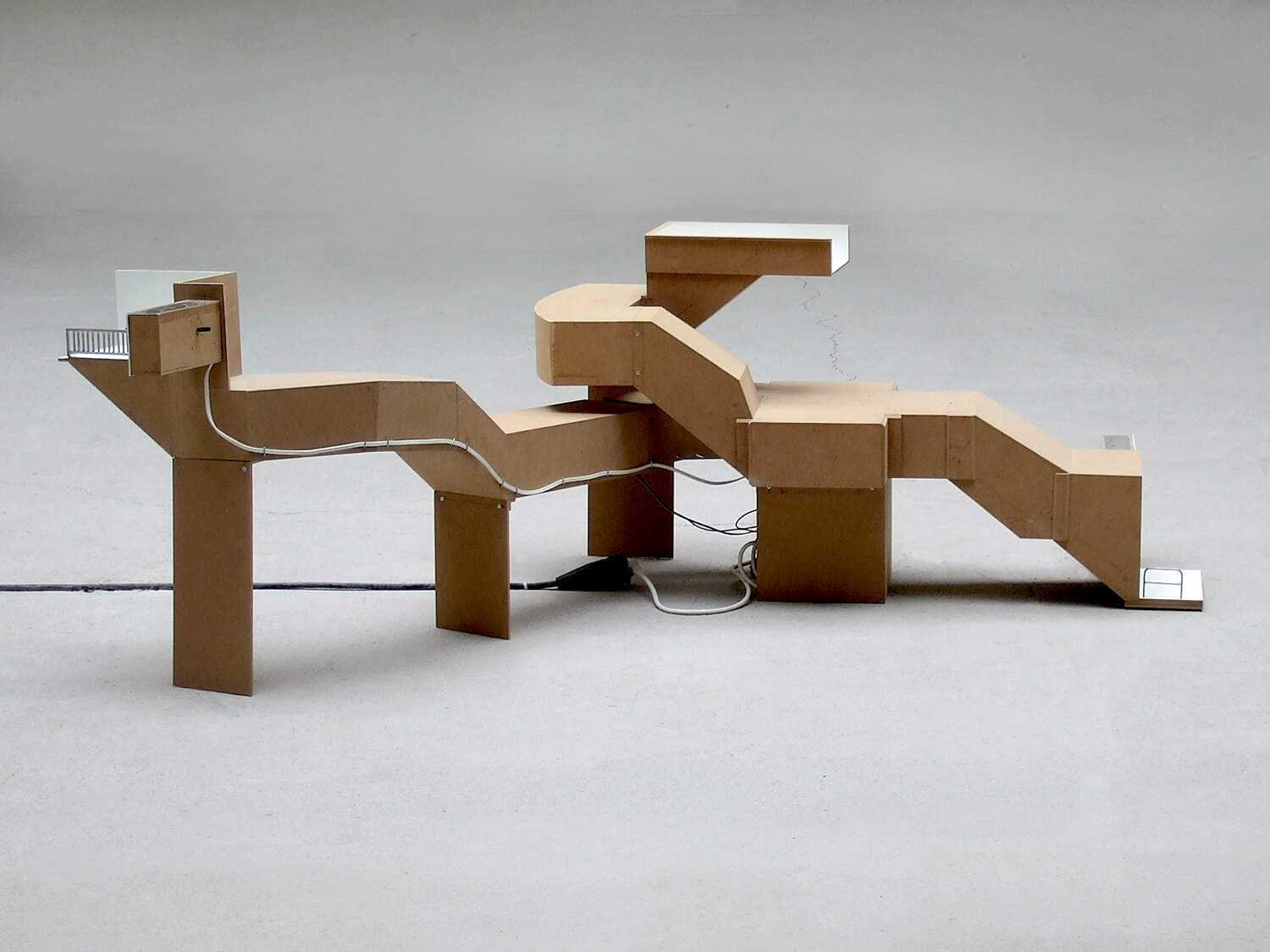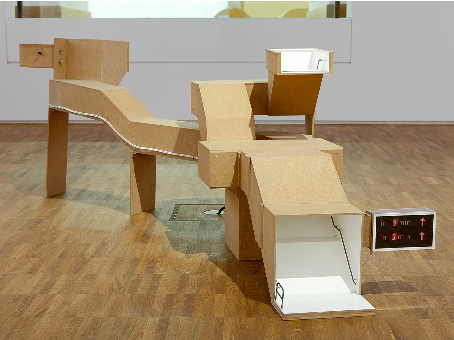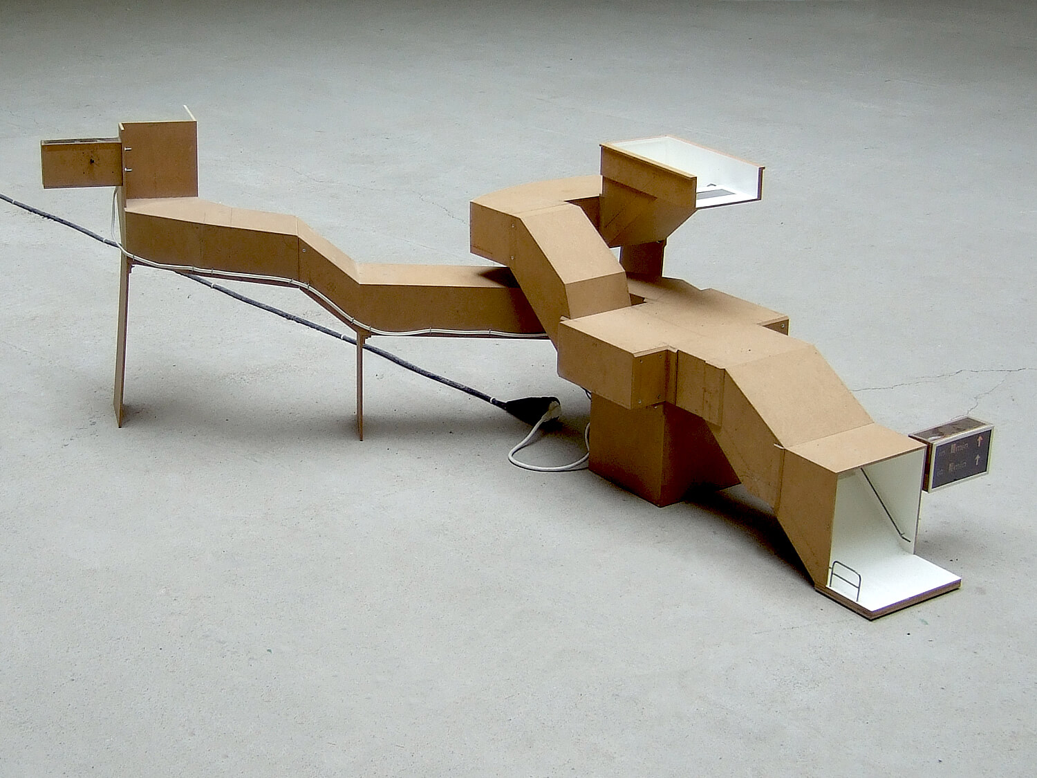 Hallesches Tor is a model-like replica of a Berlin pedestrian underground tunnel linking platforms of the subway network. Here space is excavated: the complex carved-out corridors of the pedestrian tunnel become the ‘positive’ of hidden space. The tunnel, and its human traffic, is transformed into a sculptural object. Attached to both ends of the tunnel are working reproductions of the digital countdown clocks that announce arriving and departing trains. From small speakers placed inside the tunnel the continuous music of the street musicians who play there, as well as the rushing footsteps of commuters, can be heard.