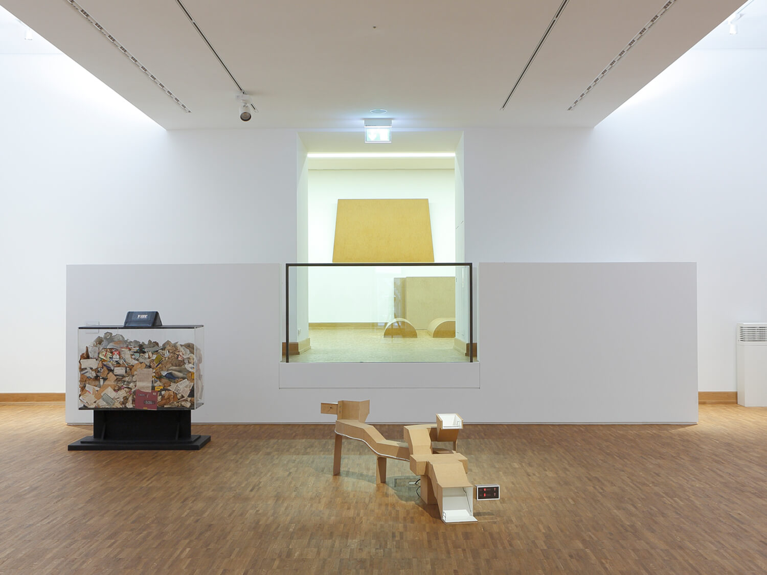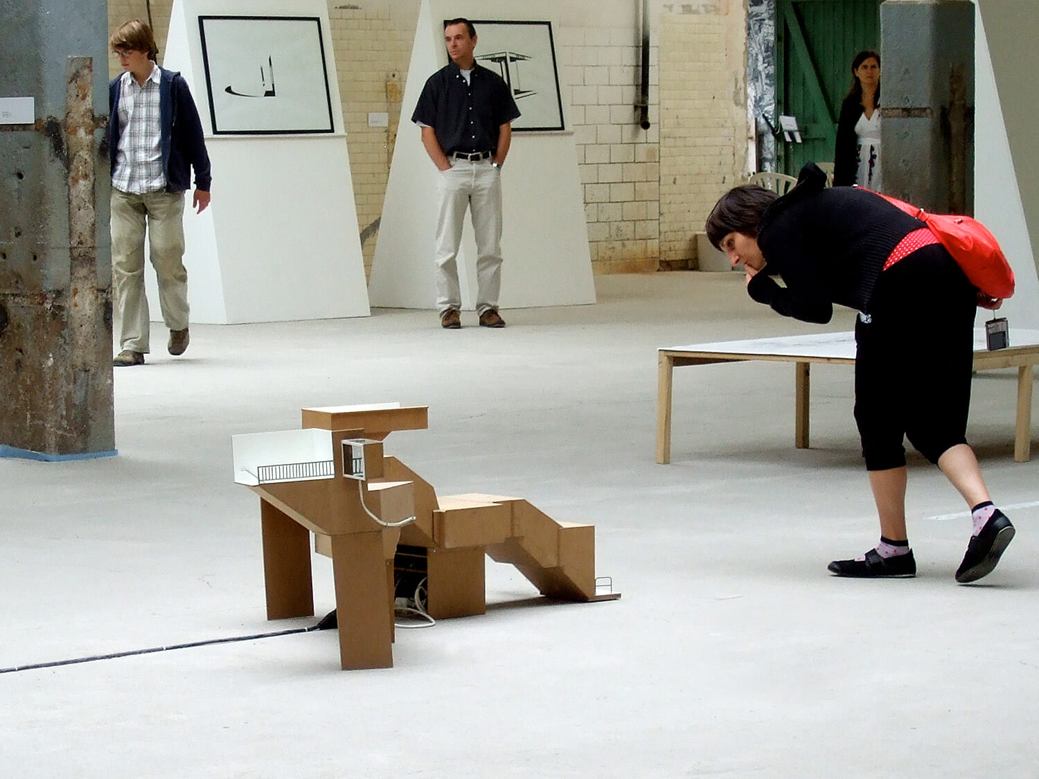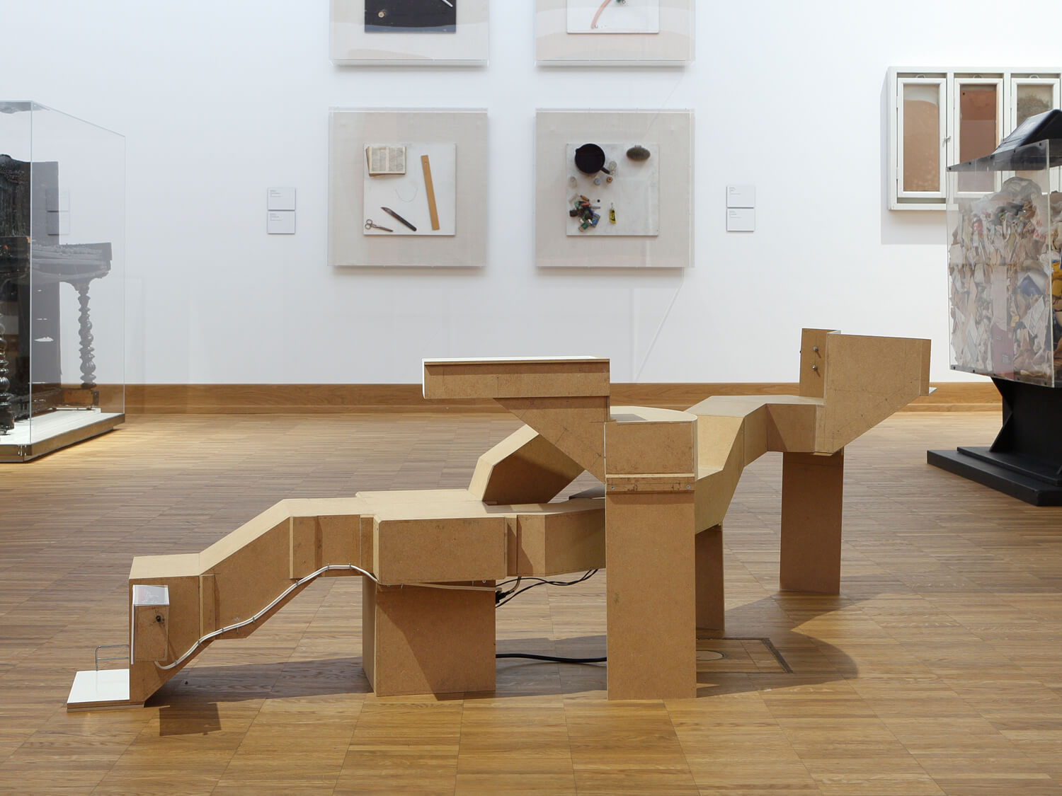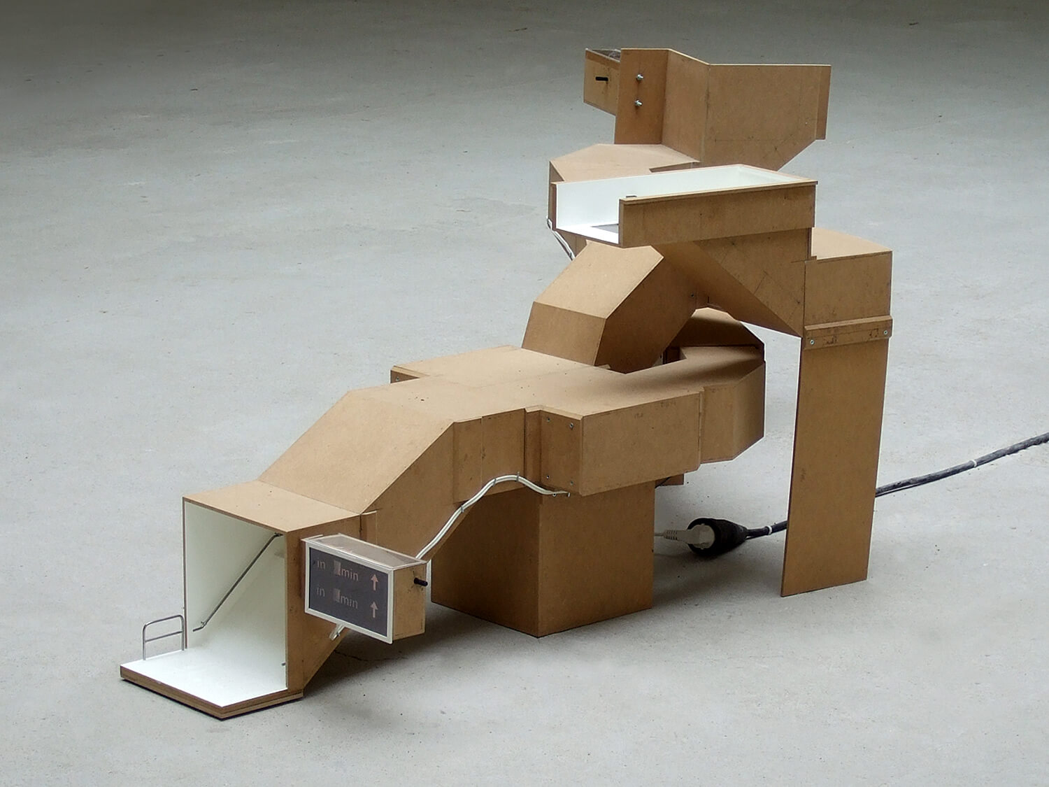 Hallesches Tor is a model-like replica of a Berlin pedestrian underground tunnel linking platforms of the subway network. Here space is excavated: the complex carved-out corridors of the pedestrian tunnel become the ‘positive’ of hidden space. The tunnel, and its human traffic, is transformed into a sculptural object. Attached to both ends of the tunnel are working reproductions of the digital countdown clocks that announce arriving and departing trains. From small speakers placed inside the tunnel the continuous music of the street musicians who play there, as well as the rushing footsteps of commuters, can be heard.
