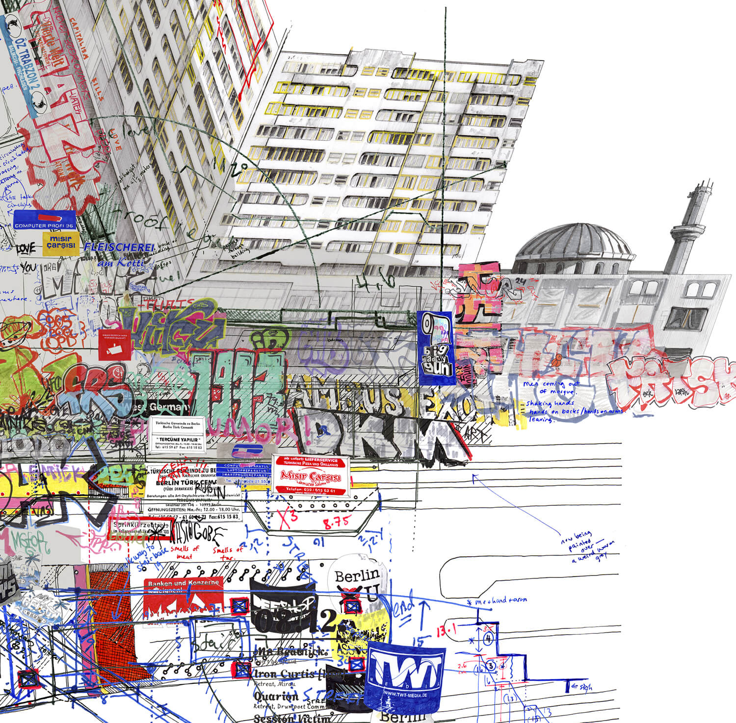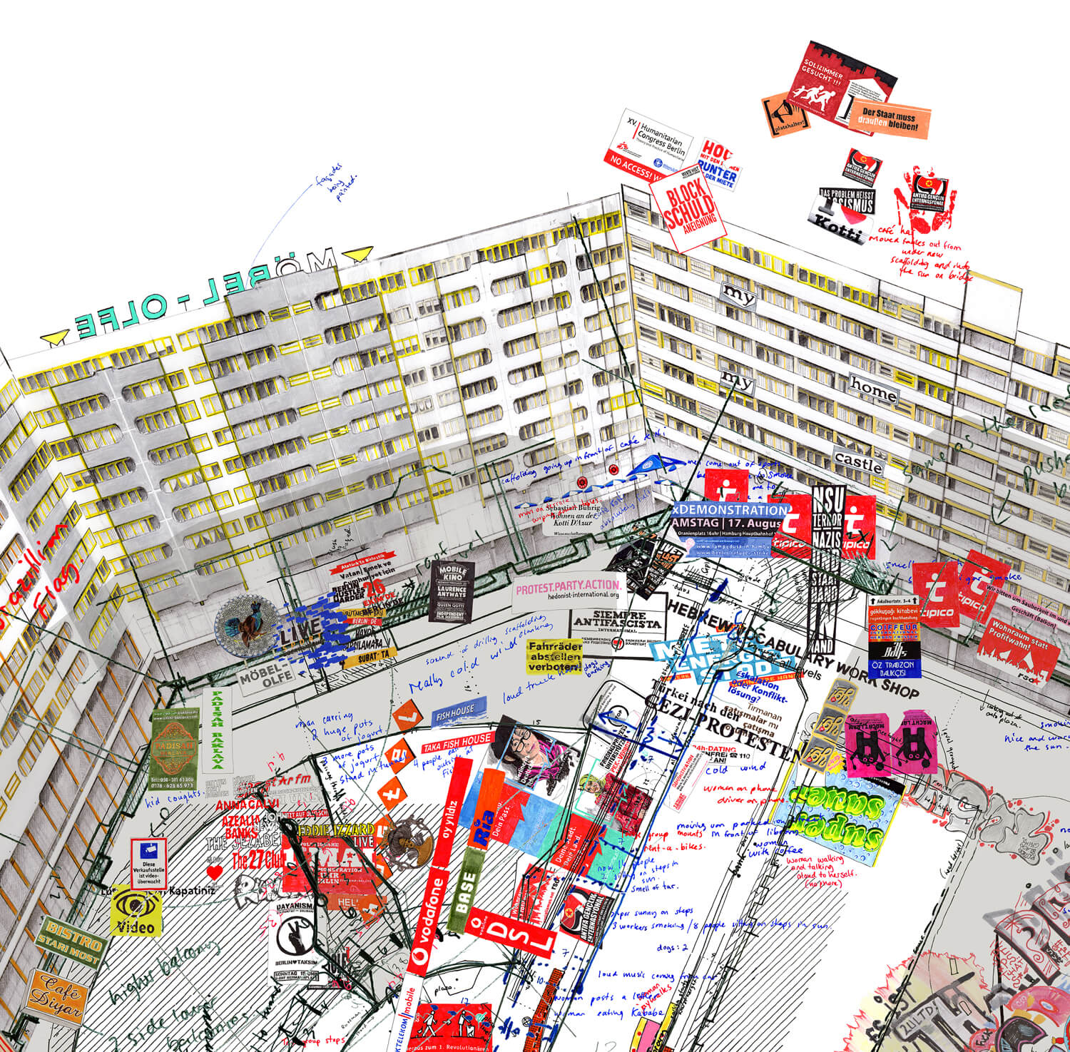 Kottbusser Tor is a transport hub formed by the meeting of several main roads in Kreuzberg that is dominated by a monolithic building: the Neues Kreuzberger Zentrum (NKZ). Built between 1969-1974, its architect Johannes Uhl had intended it to be the centrepiece of a larger regeneration plan for the area which would have seen a motorway pass just north of the NKZ. Uhl had envisioned a wide provision of communal amenities to accompany his housing scheme, but the comprehensive version of the proposal never came to fruition.