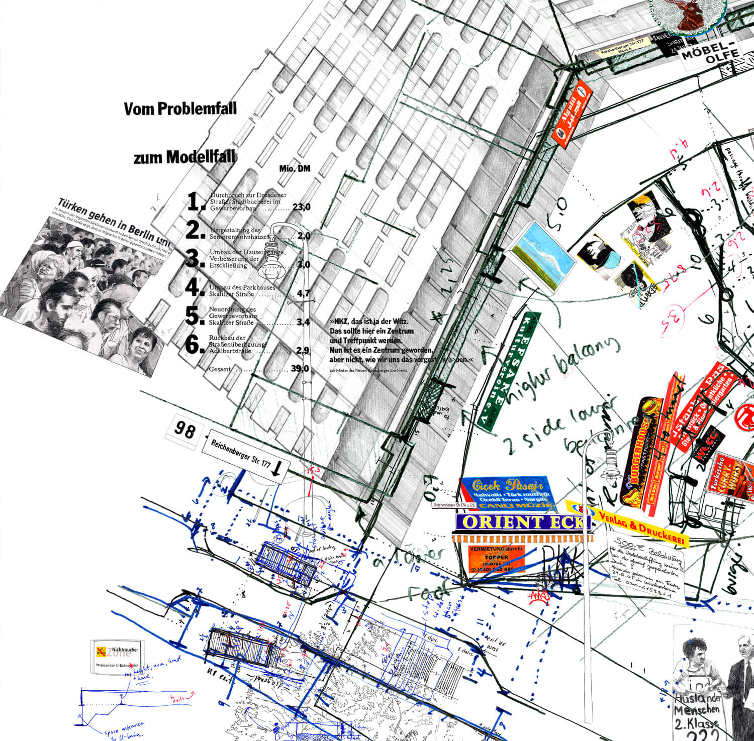 Kottbusser Tor is a transport hub formed by the meeting of several main roads in Kreuzberg that is dominated by a monolithic building: the Neues Kreuzberger Zentrum (NKZ). Built between 1969-1974, its architect Johannes Uhl had intended it to be the centrepiece of a larger regeneration plan for the area which would have seen a motorway pass just north of the NKZ. Uhl had envisioned a wide provision of communal amenities to accompany his housing scheme, but the comprehensive version of the proposal never came to fruition.
