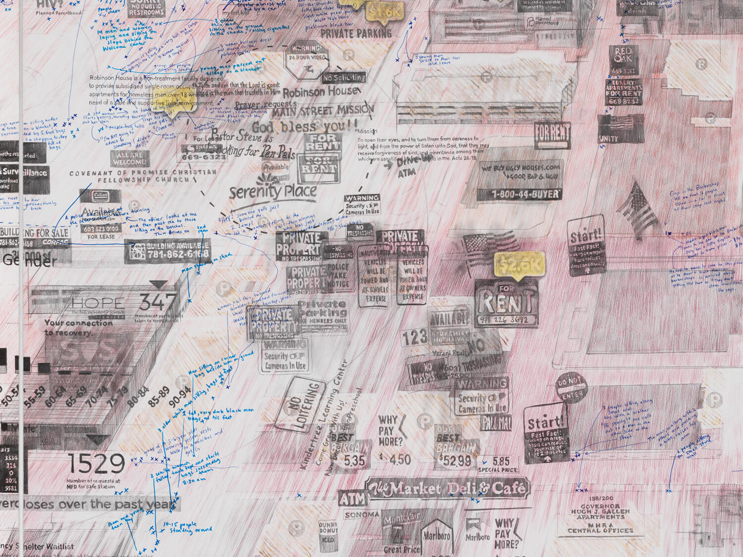 These large-scale diagrammatic drawings examine society’s failure to support those living at the margins, including unhoused people, those living below the poverty line, and, in this case, individuals impacted by the opioid crisis. The works make visible the interconnected pathways that lead to poverty, reflecting difficult truths back to the communities they depict. The facts themselves are already known. Statistics on poverty, opioid use, school dropouts, and healthcare costs are readily available. The drawings function as a call to action by bringing these realities together within a single visual field, where their cumulative impact becomes impossible to ignore.