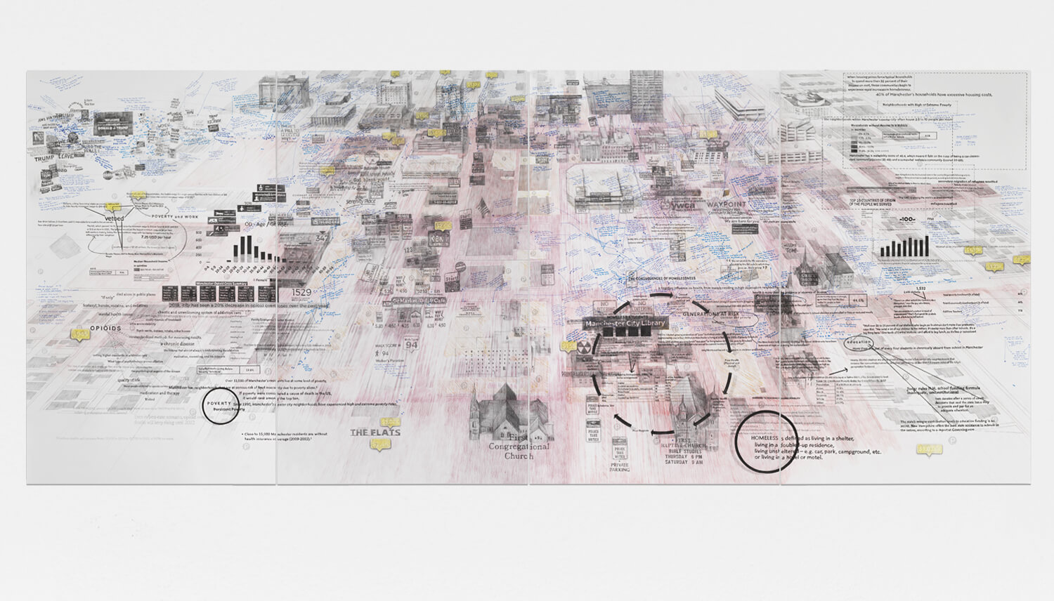 In Manchester, New Hampshire, public space is rendered dysfunctional by the dominance of car culture, the proliferation of parking lots, entrenched poverty, and an ongoing opioid crisis. These conditions leave many people struggling with housing insecurity, mental illness, and addiction to linger in parks and transit hubs that are not designed to support care or social connection. Societies suffer in the absence of well-designed and properly maintained public spaces. When public space functions well, it can foster togetherness and sustained social relations, counter inequality and polarization, and encourage collective responsibility. The work seeks to make these conditions visible while advocating for the urgent need for inclusive, thoughtfully designed public spaces.