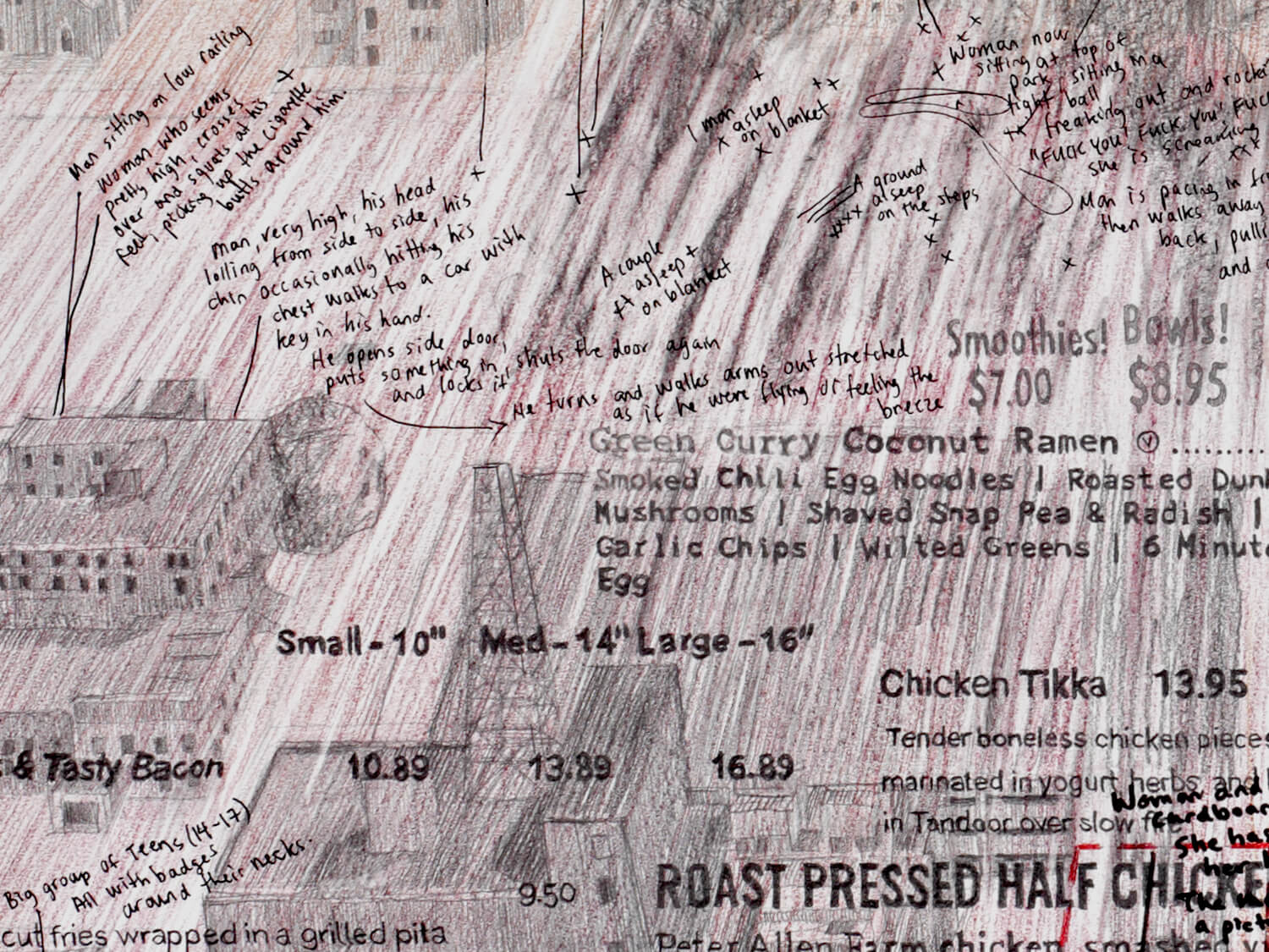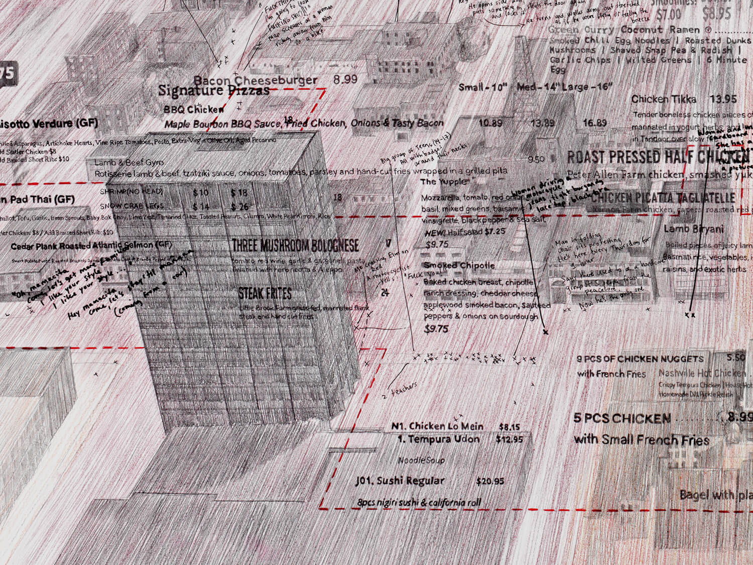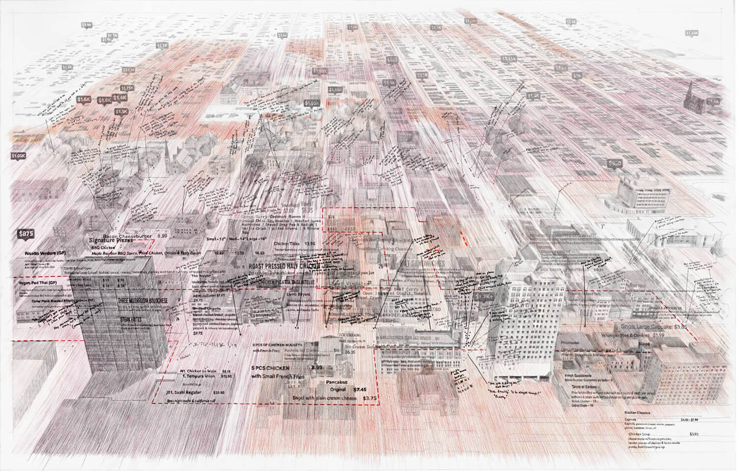 From a bird’s-eye view, the work shows how access to the city shifts with income and mobility. By recording restaurant prices and local rents, it draws attention to the rising cost of daily life and the limits this places on who can fully use the area. Walking and using public transportation revealed streets that were difficult to cross and limited access to affordable, nutritious food, even over short distances. The drawing makes visible how urban design and inequality shape who is able to participate in the life of the city.