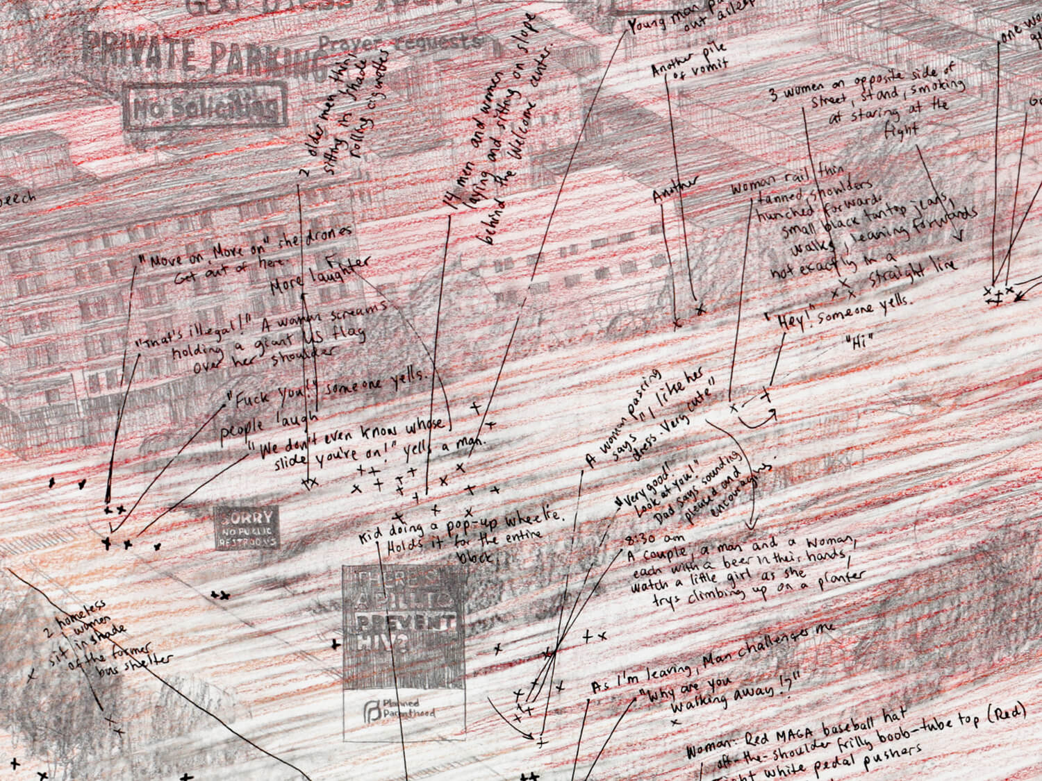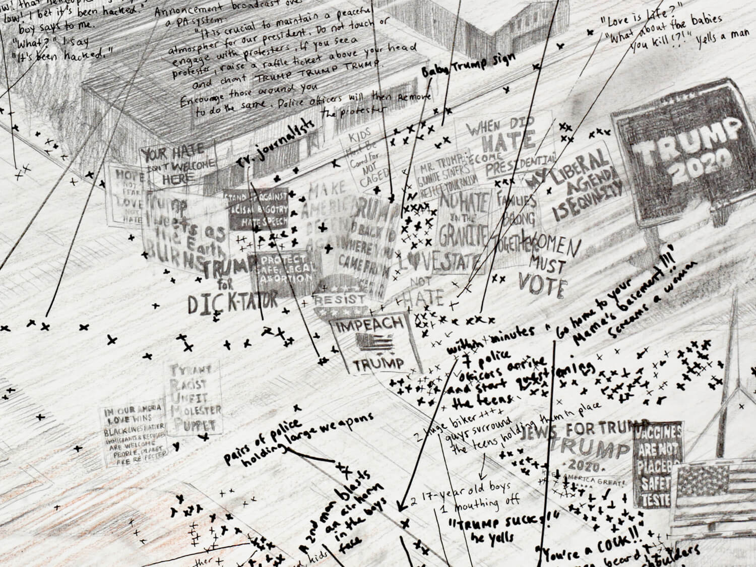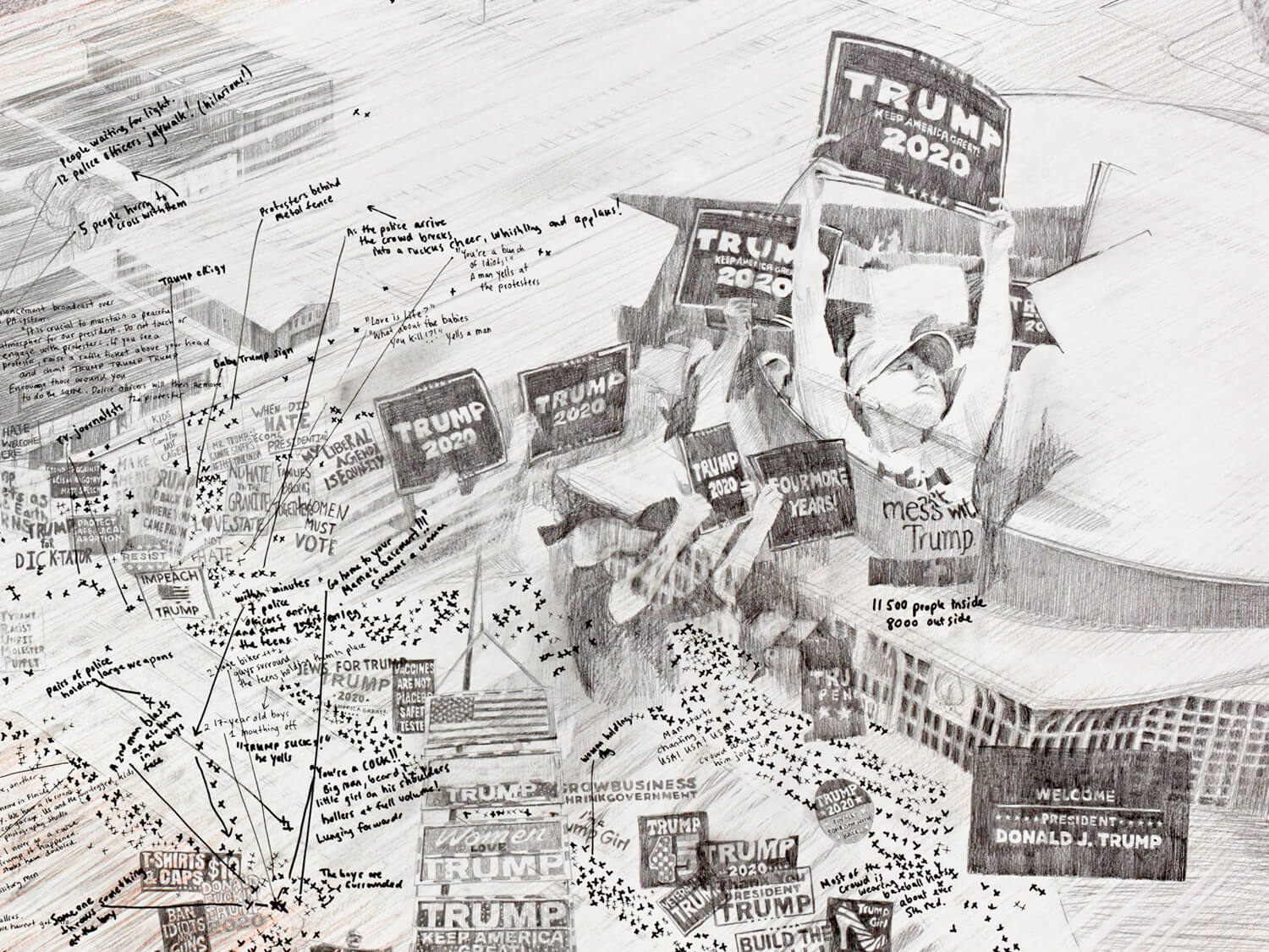 This drawing records a brief but concentrated moment in Manchester during a rally for President Donald J. Trump on August 15, 2019. Capturing just a few hours at a specific place and time, the work focuses on the movements, density, and atmosphere of a single public gathering, showing how quickly the city can shift.