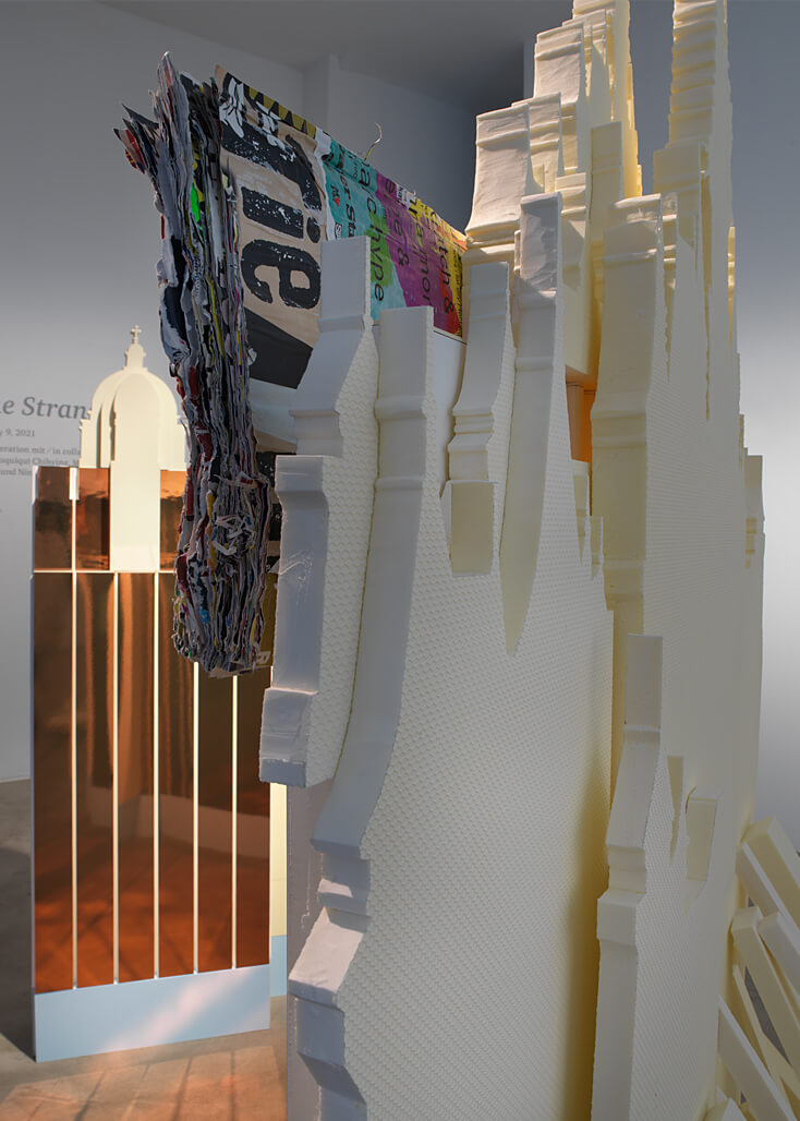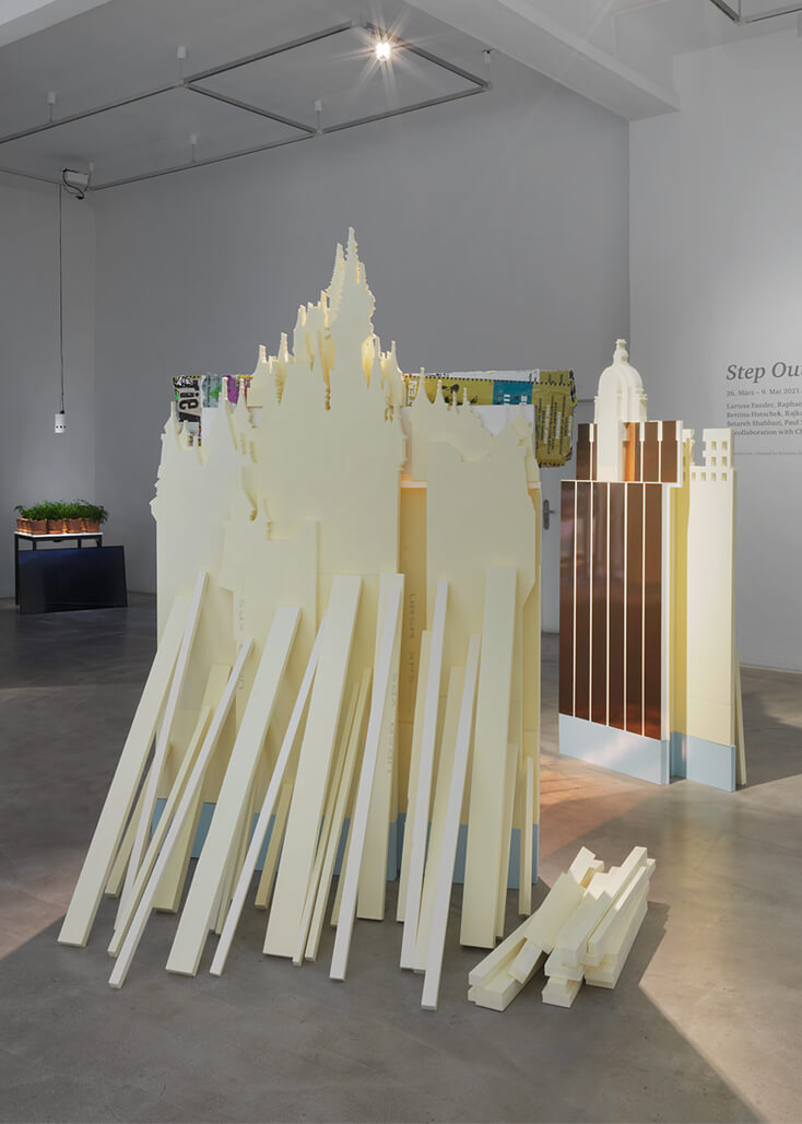 Here one palace stands opposing the other — the Palast der Republik versus the Stadtschloss. Berlin has always been characterized by city building projects that seek to forge an identity for the city. In this vein, then, the Prussian kings, the Nazis, and the East German government, among others, all attempted to shape the city as a refection of their ideology and vision. Since the Wilhelminian era, it has been a tradition here to erase the legacy of the previous generation in order to create a new concept of history. The city buildings created throughout the various different epochs and forms of government are however left behind: elements of a city that has remained thoroughly heterogeneous to this day. With the exhibition title, I play on the attempt to homogenize the city’s image and to cleanse it of undesired relics: in the English translation of “Palast/Schloss” to “Palace/Palace,” the two terms are blurred, the sides become interchangeable and the political and ideological conflicts smoothed. For critics of the rebuilding of the Stadtschloss, however, the planned historicizing structure is a historical forgery, an anti-modern, Disneyfied façade that deliberately omits the 20th century to suggest a historical continuity that has never existed in this form.