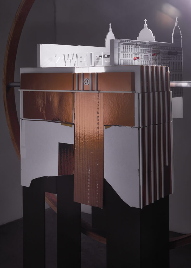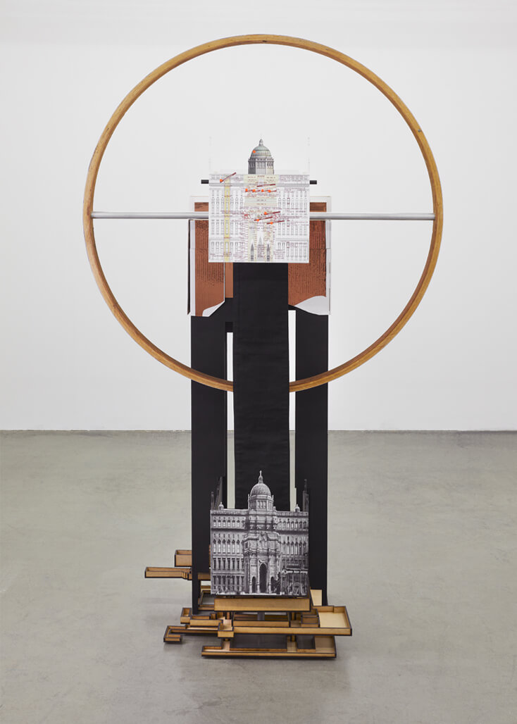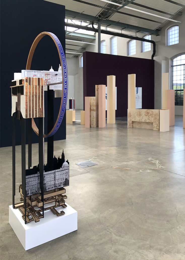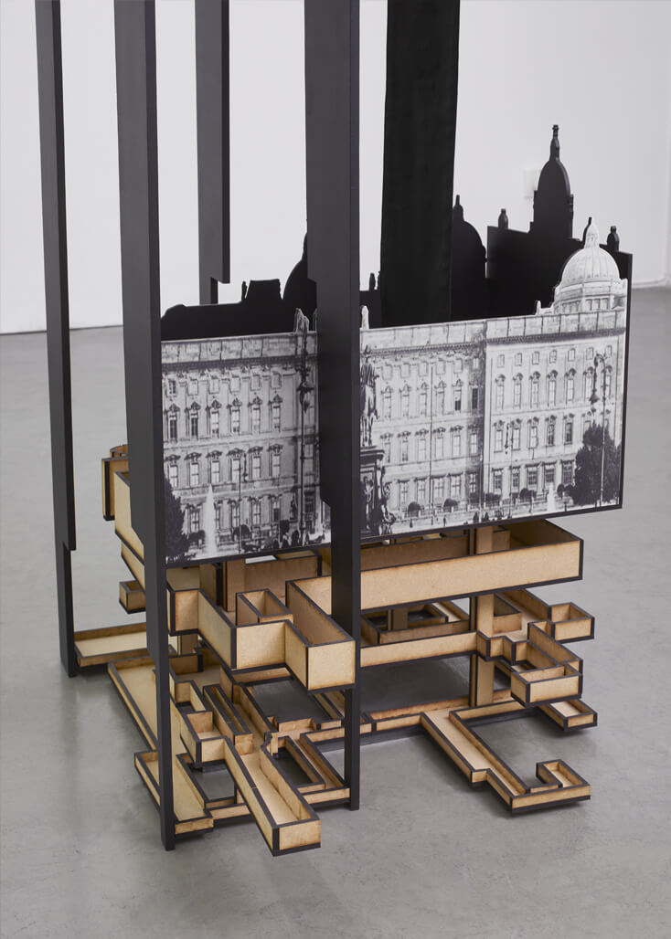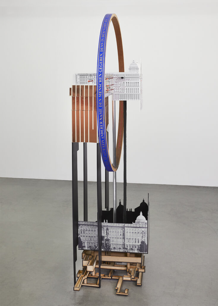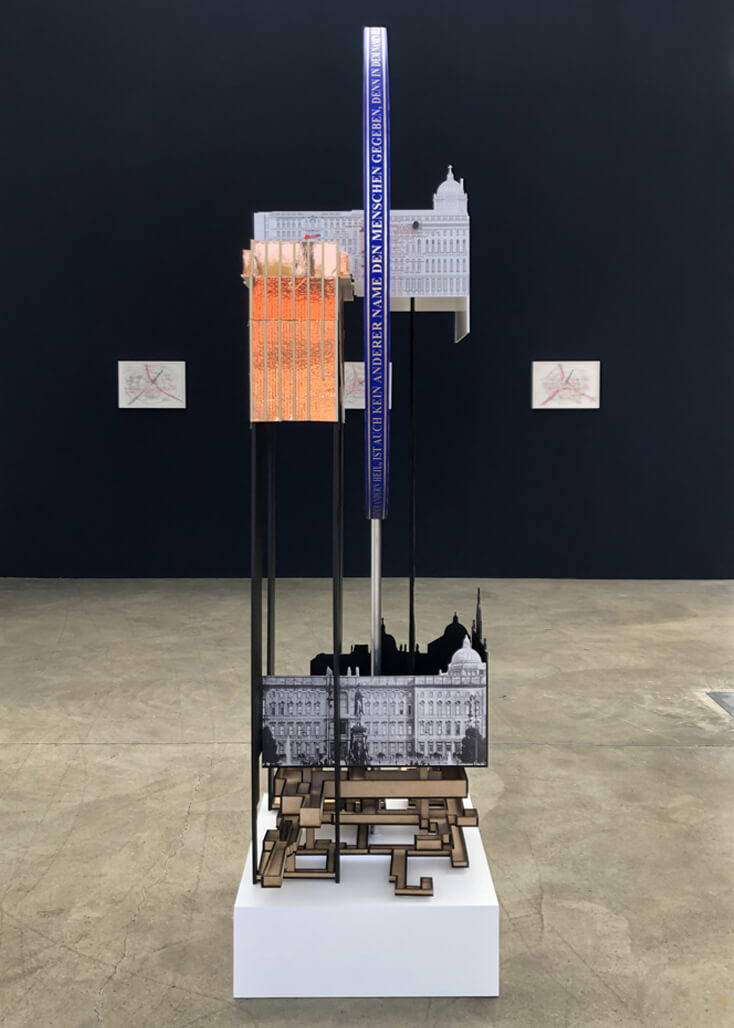 Palaces / Palaces is a tall free standing sculpture, which acts as a three-dimensional timeline. It depicts an extremely complex and contested site in the heart of Berlin, the Schlossplatz, which is situated on the Museum Island in Berlin-Mitte. This work traces the power dynamics at play on this site, as well as delineates the material and cultural lines of conflict that have shaped and are still shaping this place.