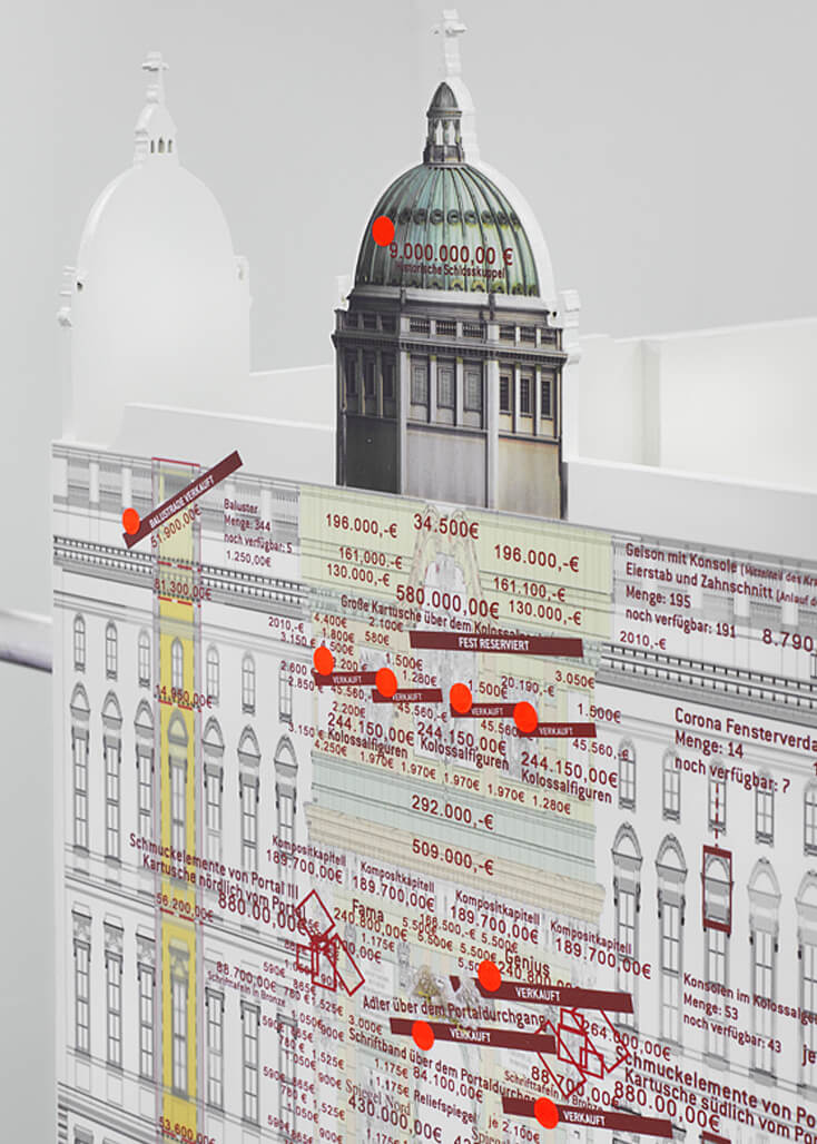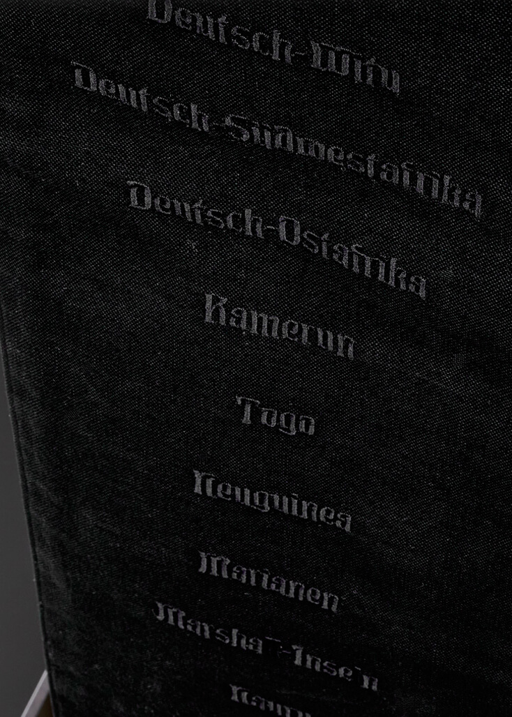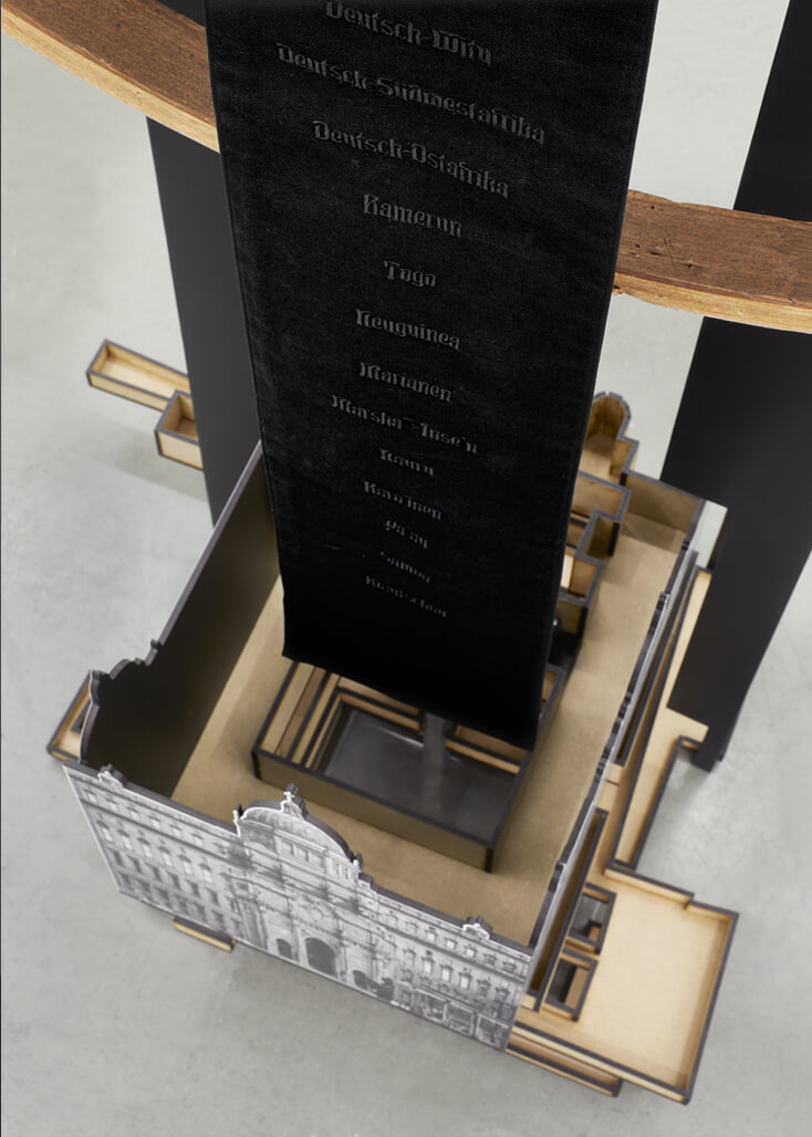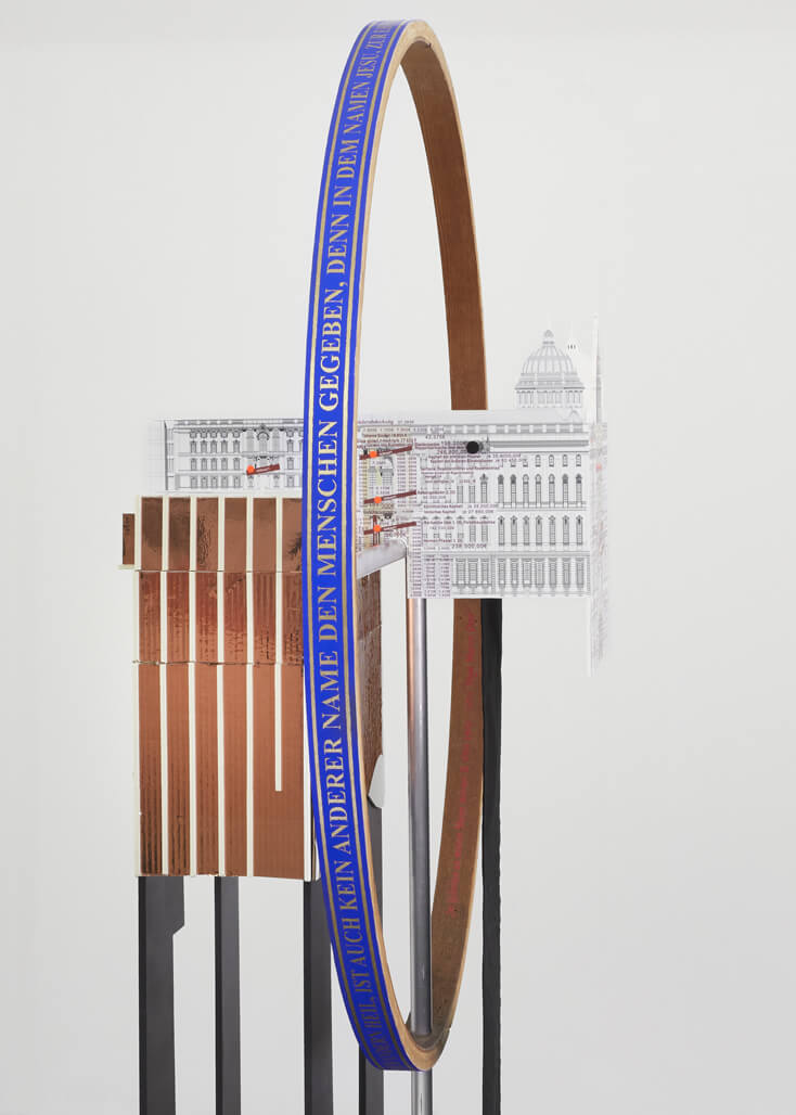 Model versions of the four former imperial castles that occupied this piece of land in 1650, 1690, 1750 and 1900 are stacked at its base. Heavy cut black steel moves upwards, marking the dark years of National Socialism. At the top, a model of the Palast der Republik, battered with its gold foil pealing, is straddled by the newly reconstructed imperial palace. Hung from this new palace and reaching almost to the floor is a mourning banner. Black embroidery on black cloth, it lists the names of the former German colonies and connect this new palace to the ones at its base. Finally, a massive blue ring, replicating the actual ring on the reconstructed palace, encircles and frames the object. As on the reconstructed place, the gilded Christian inscription commands: “that at the name of Jesus every knee should bow, of those who are in heaven, and on earth, and under the earth”.