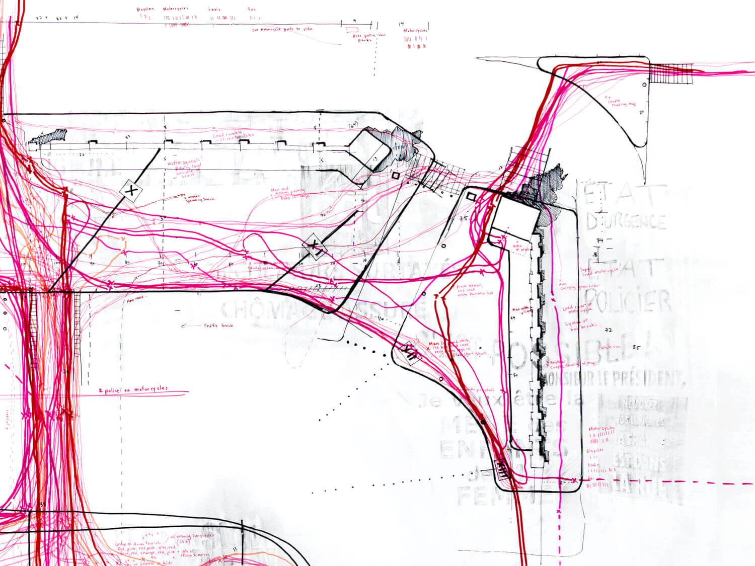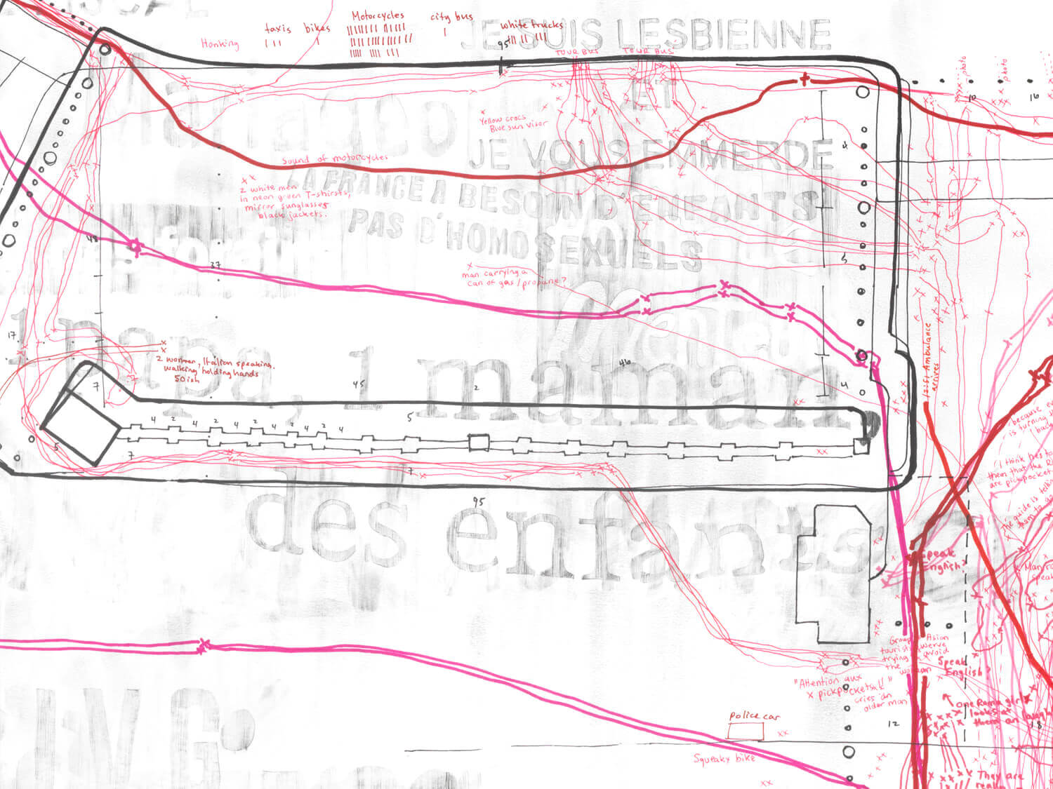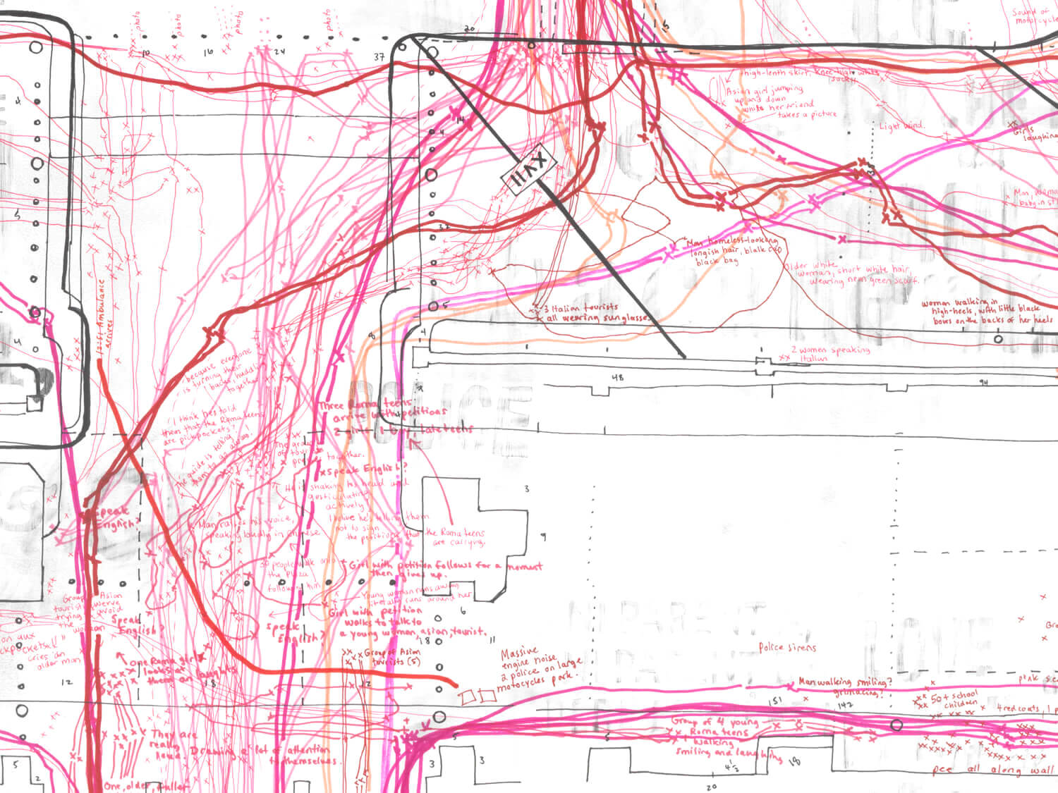 Pink trajectories trace the movement of individuals across the plaza. Notes in red and pink record police sirens, motorcycles, and interactions—mostly between tourists and Roma teens.