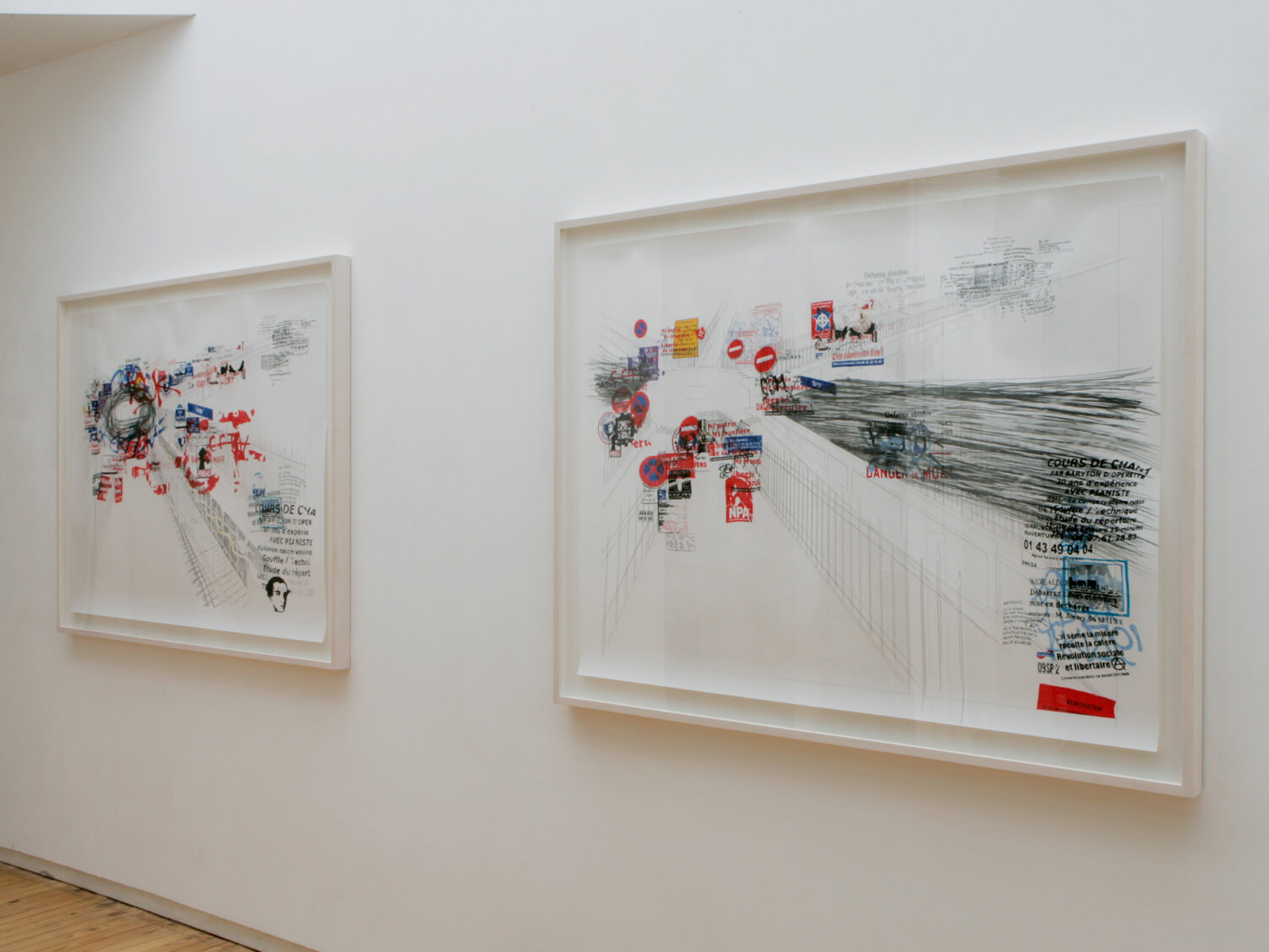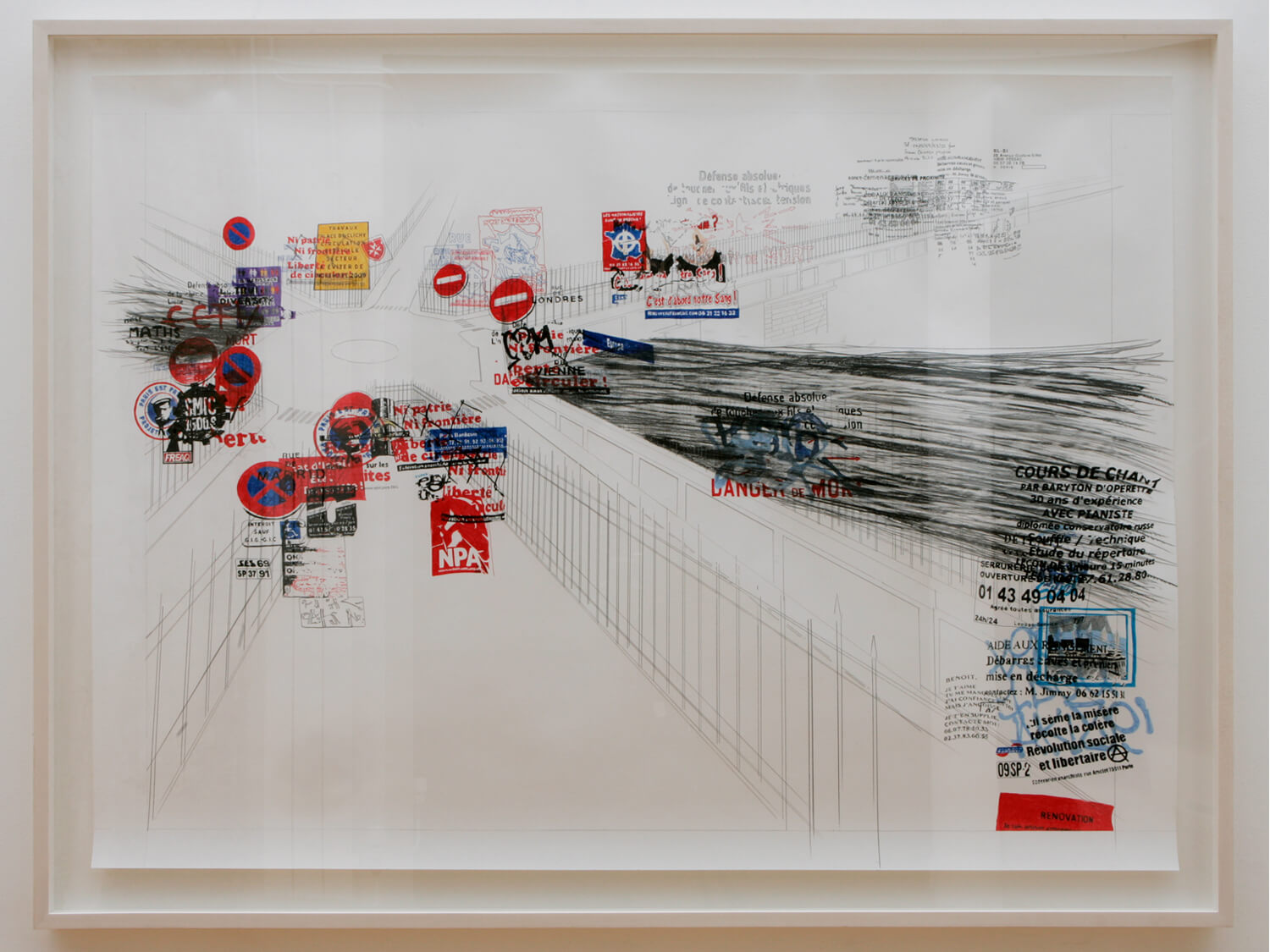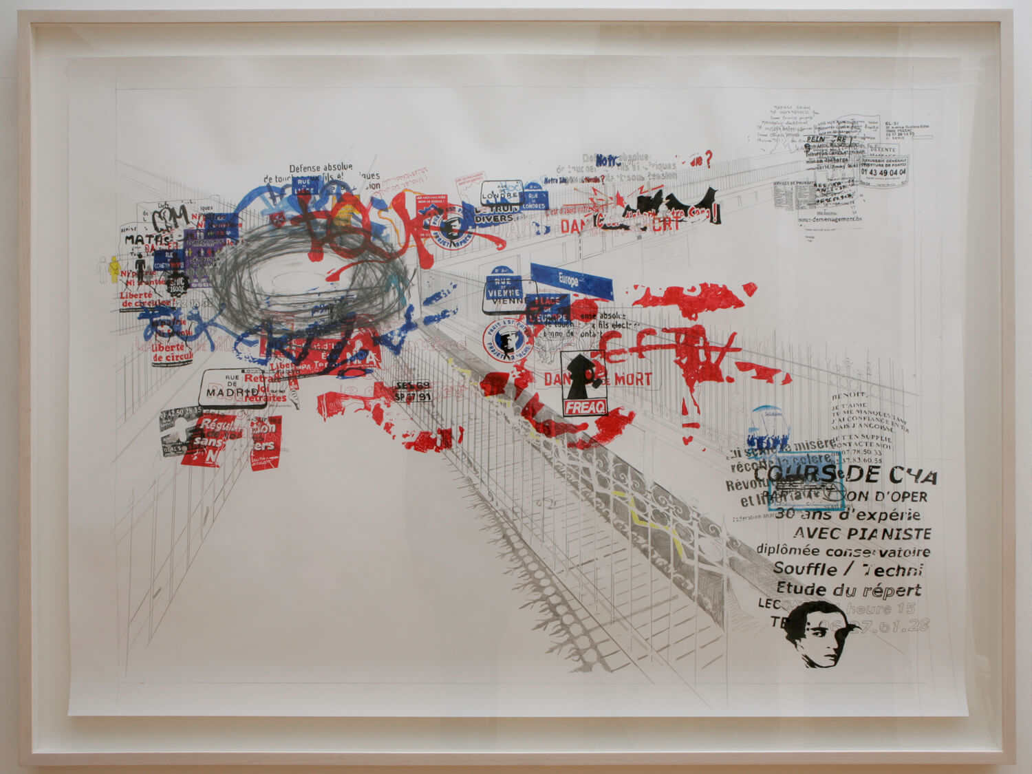 Place de l’Europe I and II take Gustave Caillebotte’s famous Impressionist painting Pont de l’Europe (1876) as their point of departure. The painting depicts people from different social classes standing side by side before an ironwork symbol of modernity. Today, the location, which was also painted by Jean Béraud and Monet and famously photographed by Henri Cartier-Bresson, is a wasteland with a prestigious name, dominated by a traffic circle, parked cars, passing buses, and exhaust-filled air. On nearly every sign, pole, and parking meter, the space is covered with signs and symbols that speak to the extreme left and right of the French political spectrum (e.g., “Ni patrie, ni frontière – liberté de circuler!”, “Fédération anarchiste”, “Nouveau Parti anticapitaliste”, “Les nationalistes sont de retour!”, “Le métissage généralisé détruit la diversité!”, “Paris projet apache”). On the periphery stand personal ads and appeals, ranging from people looking for work to a family searching for a lost loved one.