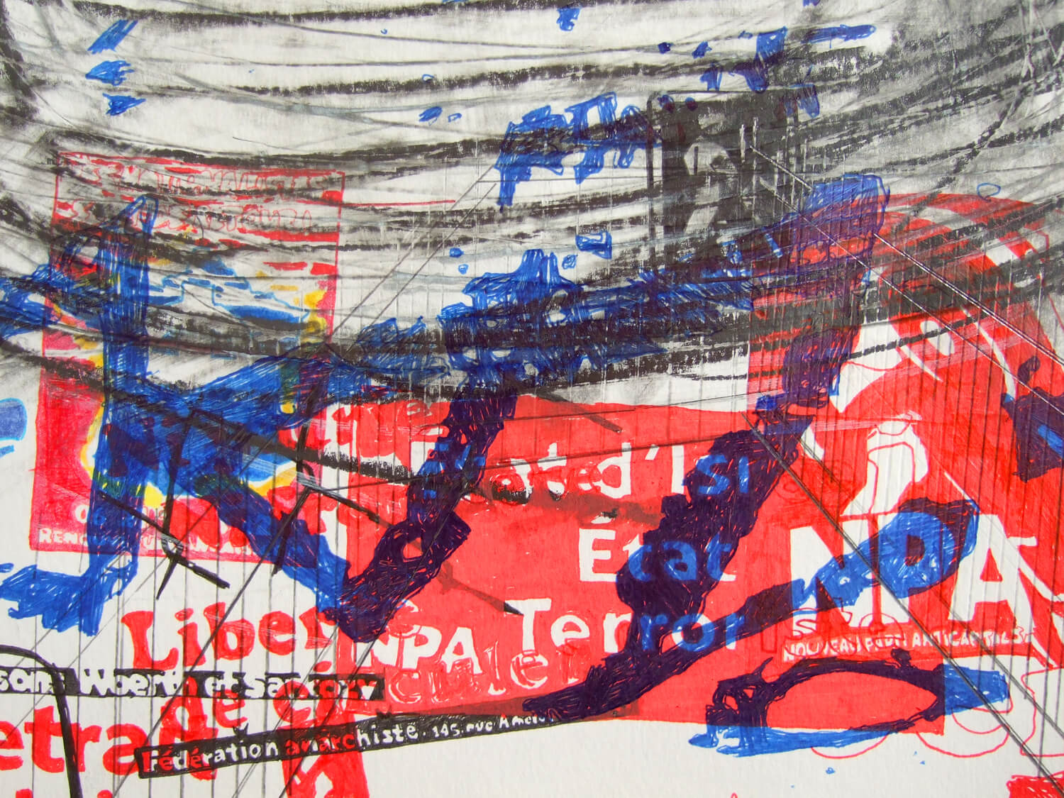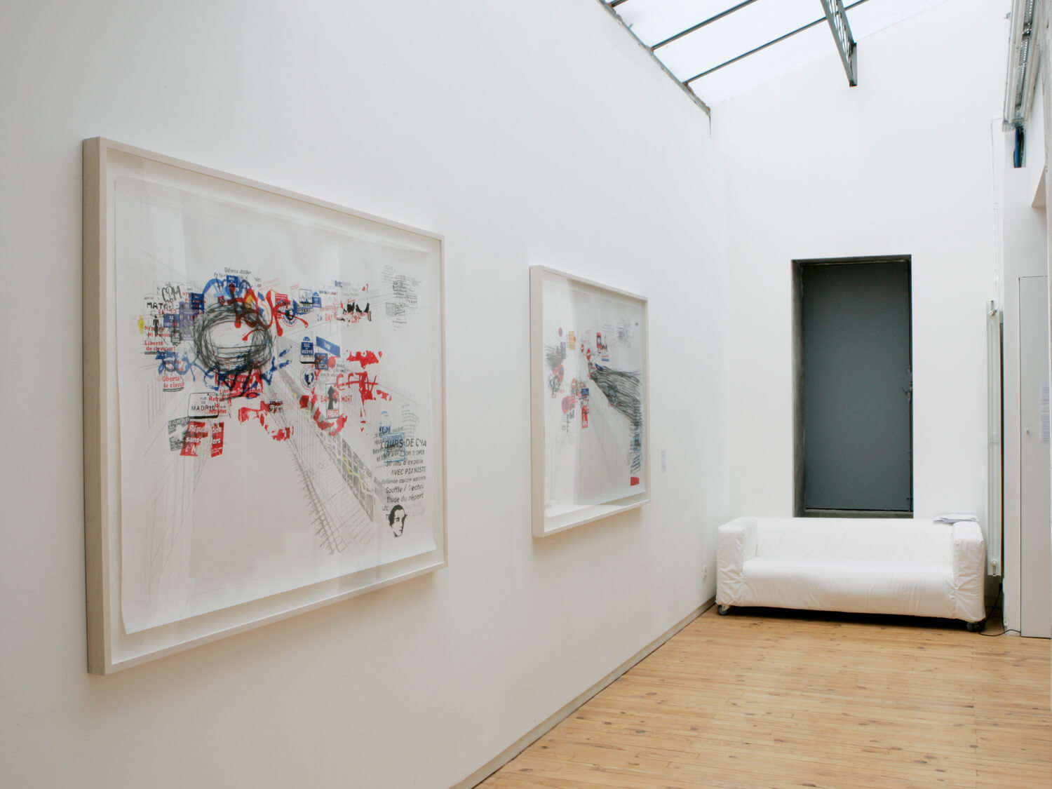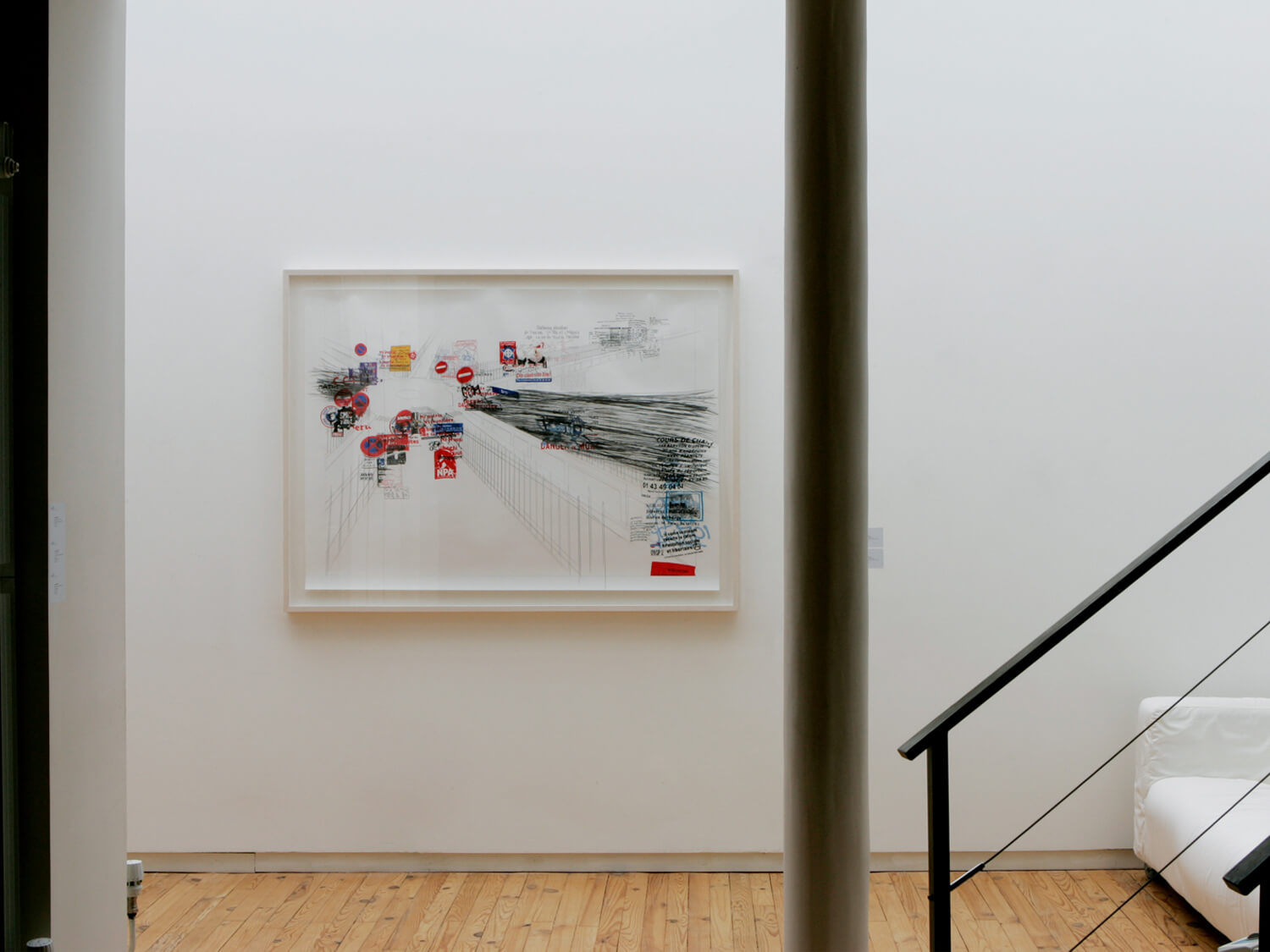 Place de l’Europe I and II take Gustave Caillebotte’s famous Impressionist painting Pont de l’Europe (1876) as their point of departure. The painting depicts people from different social classes standing side by side before an ironwork symbol of modernity. Today, the location, which was also painted by Jean Béraud and Monet and famously photographed by Henri Cartier-Bresson, is a wasteland with a prestigious name, dominated by a traffic circle, parked cars, passing buses, and exhaust-filled air. On nearly every sign, pole, and parking meter, the space is covered with signs and symbols that speak to the extreme left and right of the French political spectrum (e.g., “Ni patrie, ni frontière – liberté de circuler!”, “Fédération anarchiste”, “Nouveau Parti anticapitaliste”, “Les nationalistes sont de retour!”, “Le métissage généralisé détruit la diversité!”, “Paris projet apache”). On the periphery stand personal ads and appeals, ranging from people looking for work to a family searching for a lost loved one.
