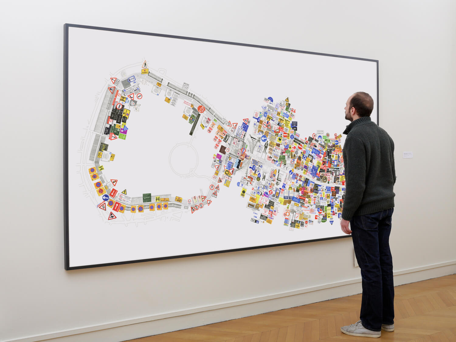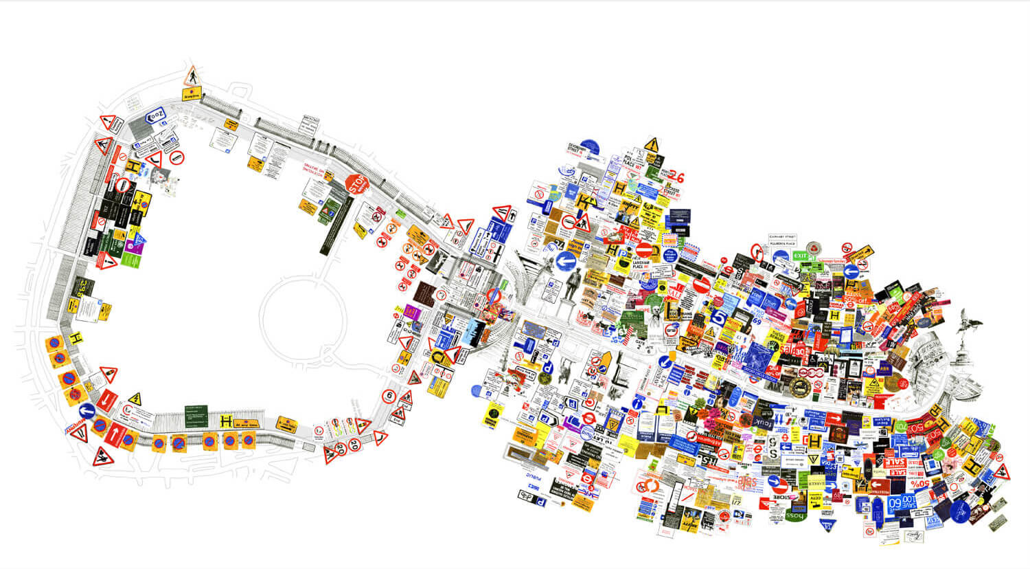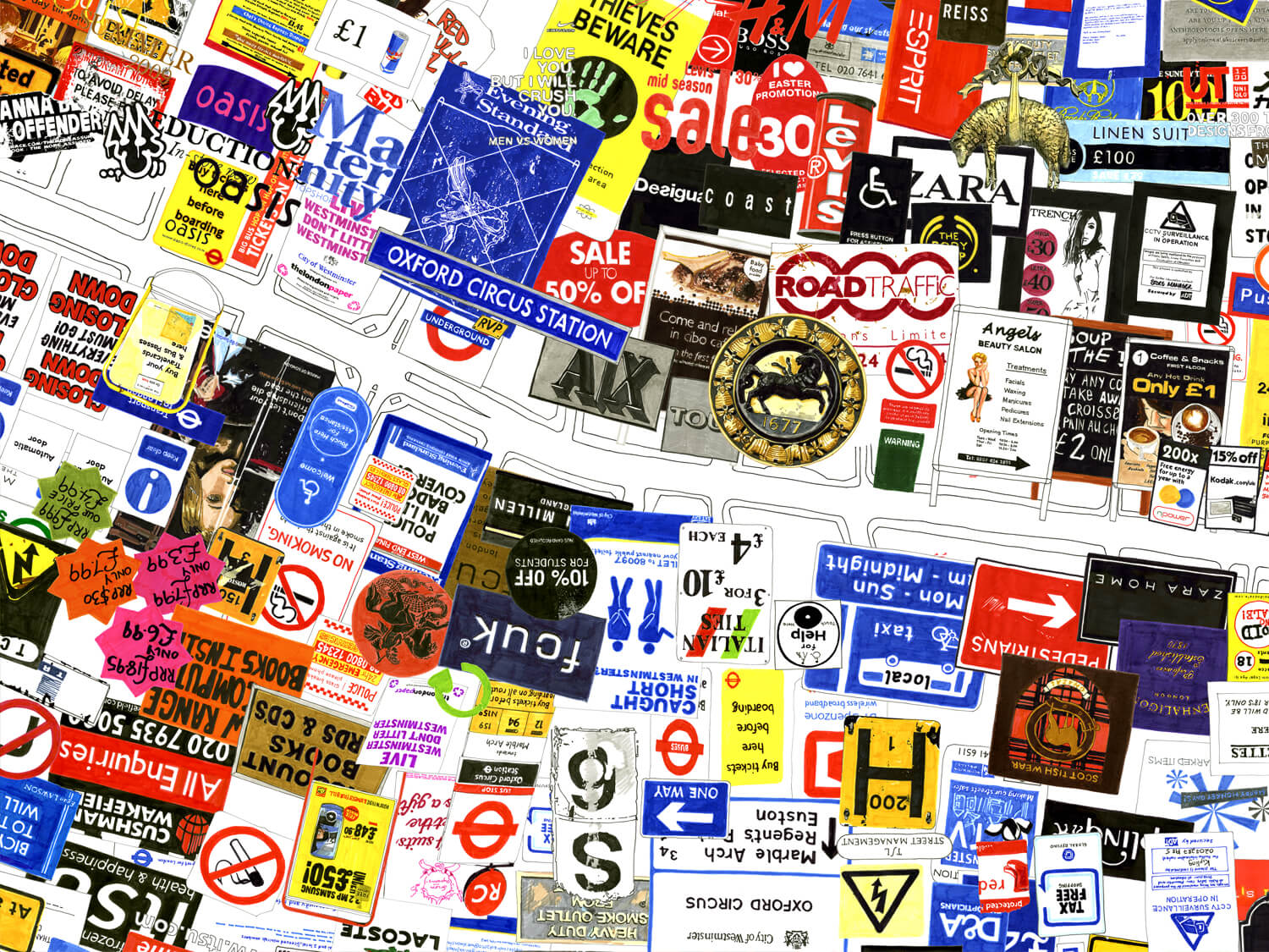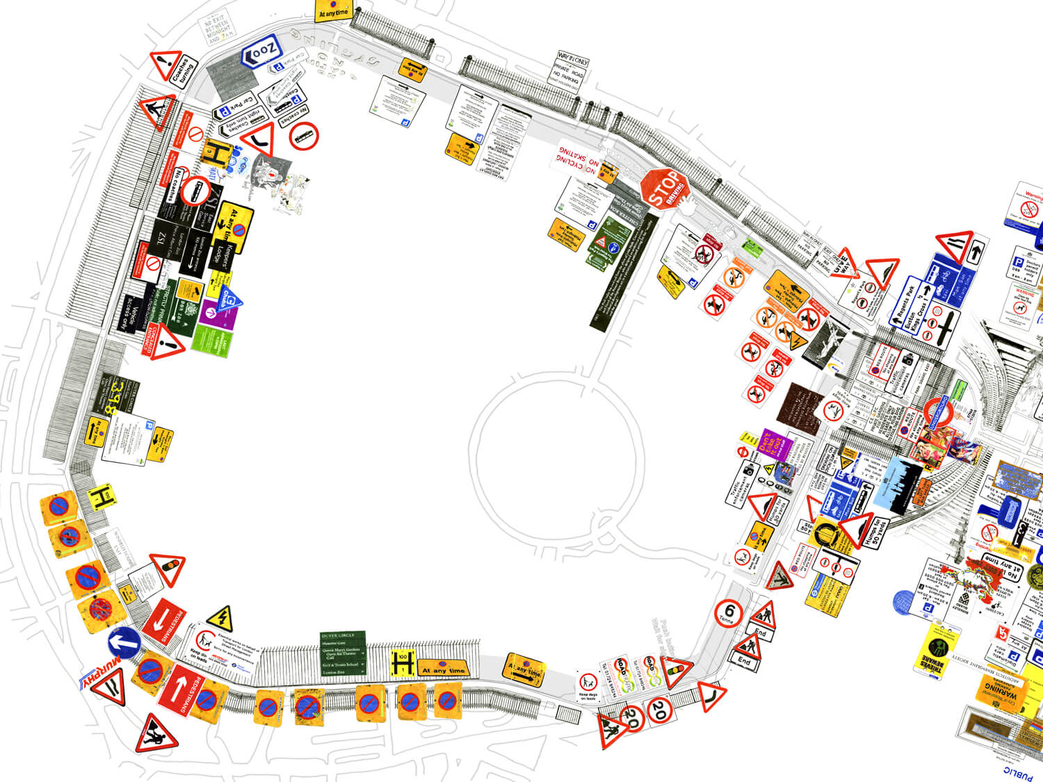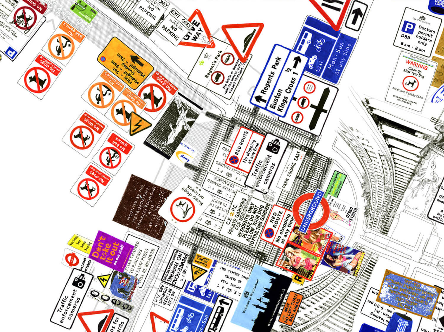 Regent Street / Regent’s Park (Dickens Thought It Looked Like a Racetrack) investigates major 19th-century urban development changes that, for the first time, favoured the individual’s freedom of movement, while its architecture restricted collective movement and gatherings. For this work, I roamed Regent Street and the area around the park for several days, photographing as many shop and street signs, fences, and barriers as I could. I subsequently redrew and scanned them all, then installed them in a true-to-scale site plan of the streets. The result is an overload of pictures, logos, signals, and signs that regulate the movements and perceptions of passersby.