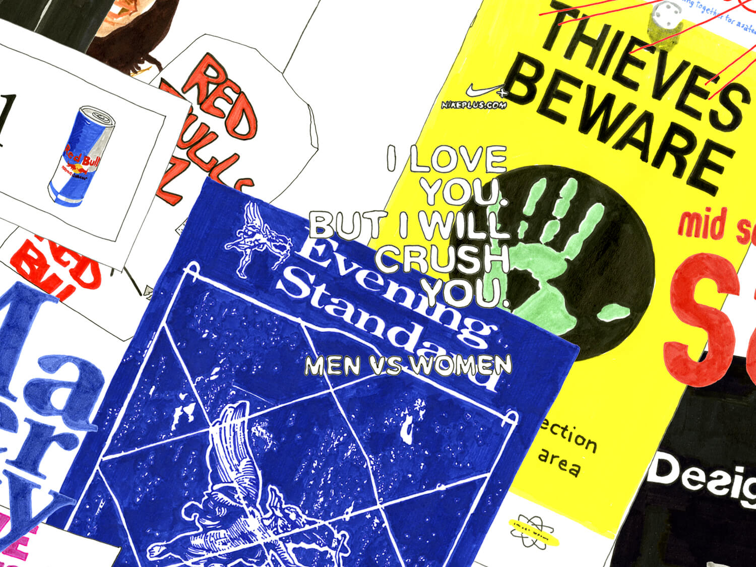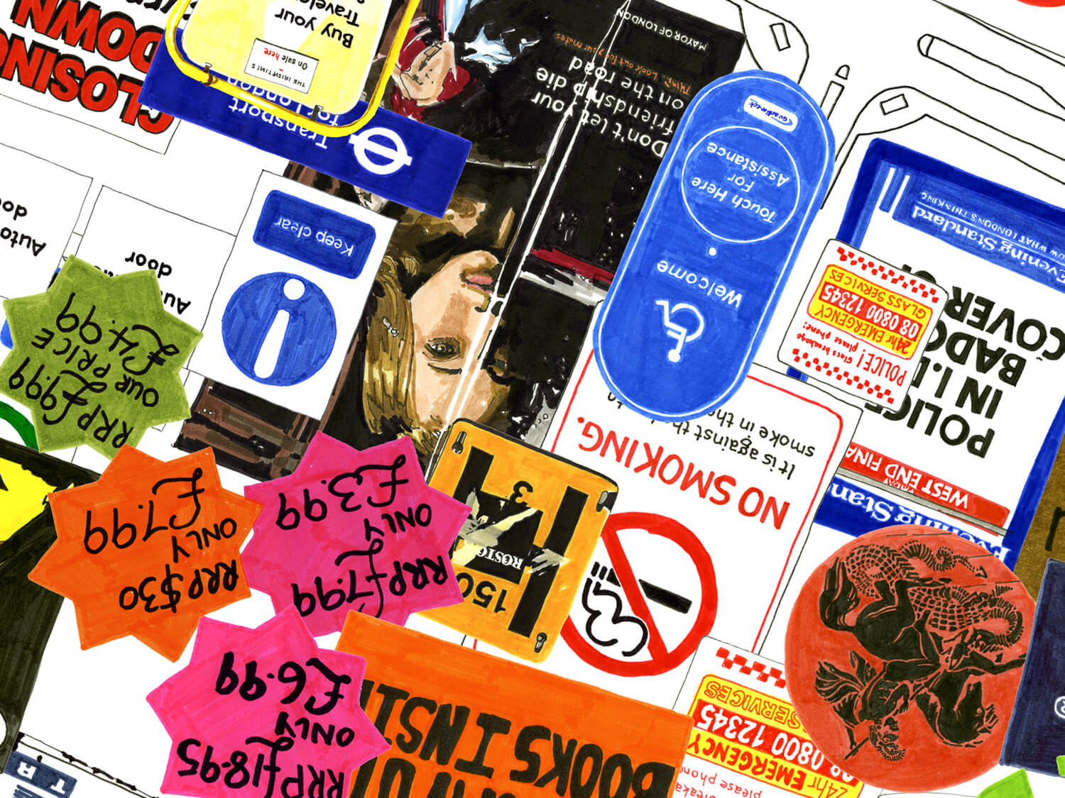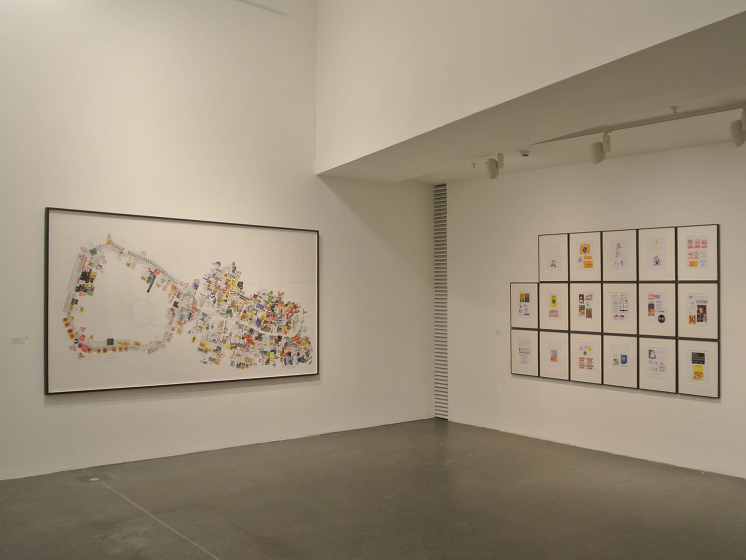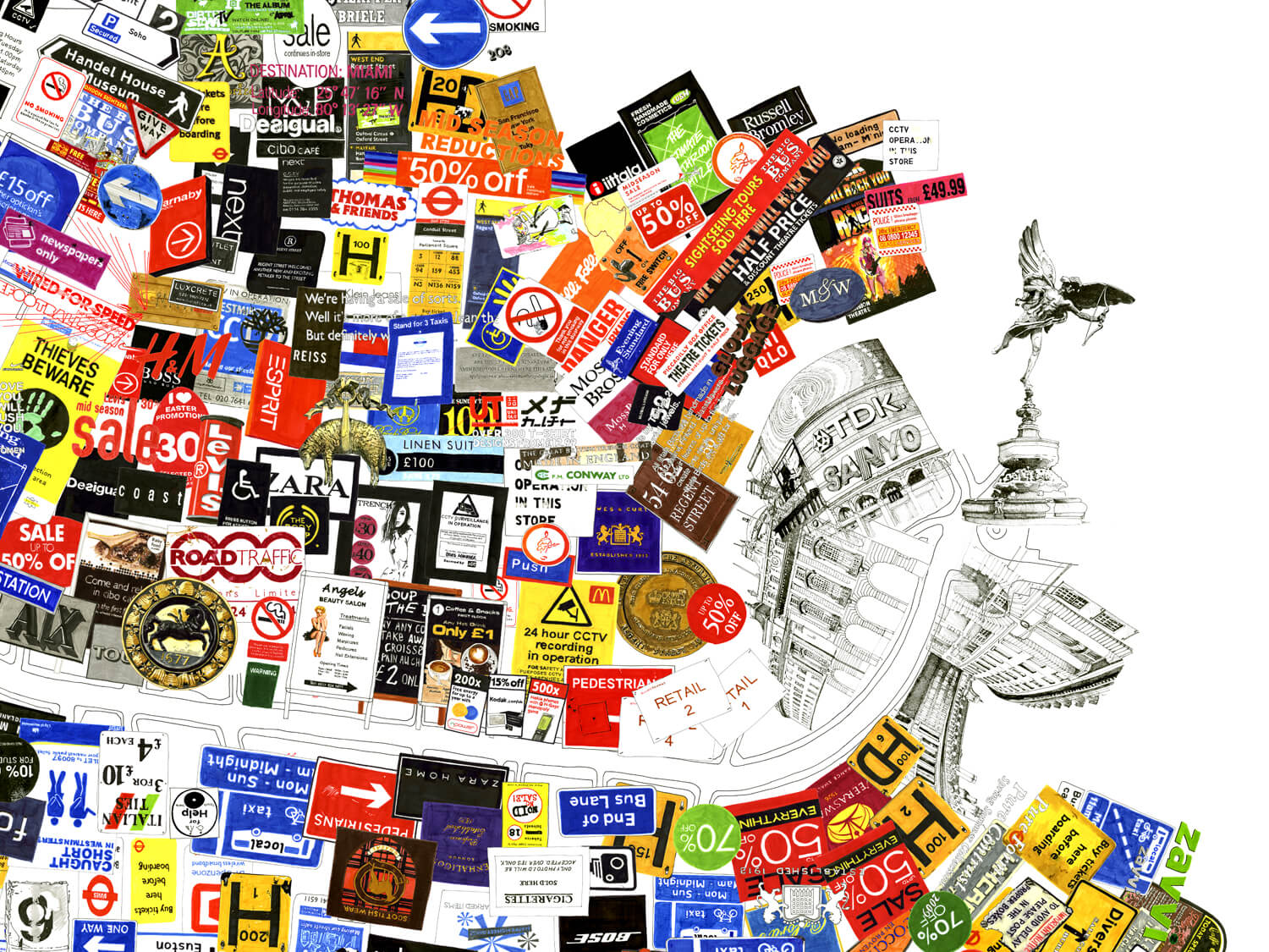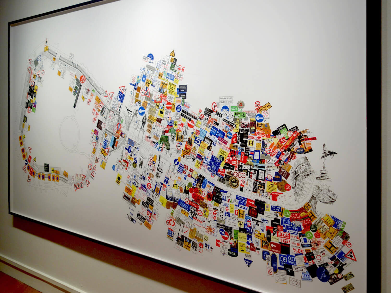 Regent Street / Regent’s Park (Dickens Thought It Looked Like a Racetrack) investigates major 19th-century urban development changes that, for the first time, favoured the individual’s freedom of movement, while its architecture restricted collective movement and gatherings. For this work, I roamed Regent Street and the area around the park for several days, photographing as many shop and street signs, fences, and barriers as I could. I subsequently redrew and scanned them all, then installed them in a true-to-scale site plan of the streets. The result is an overload of pictures, logos, signals, and signs that regulate the movements and perceptions of passersby.