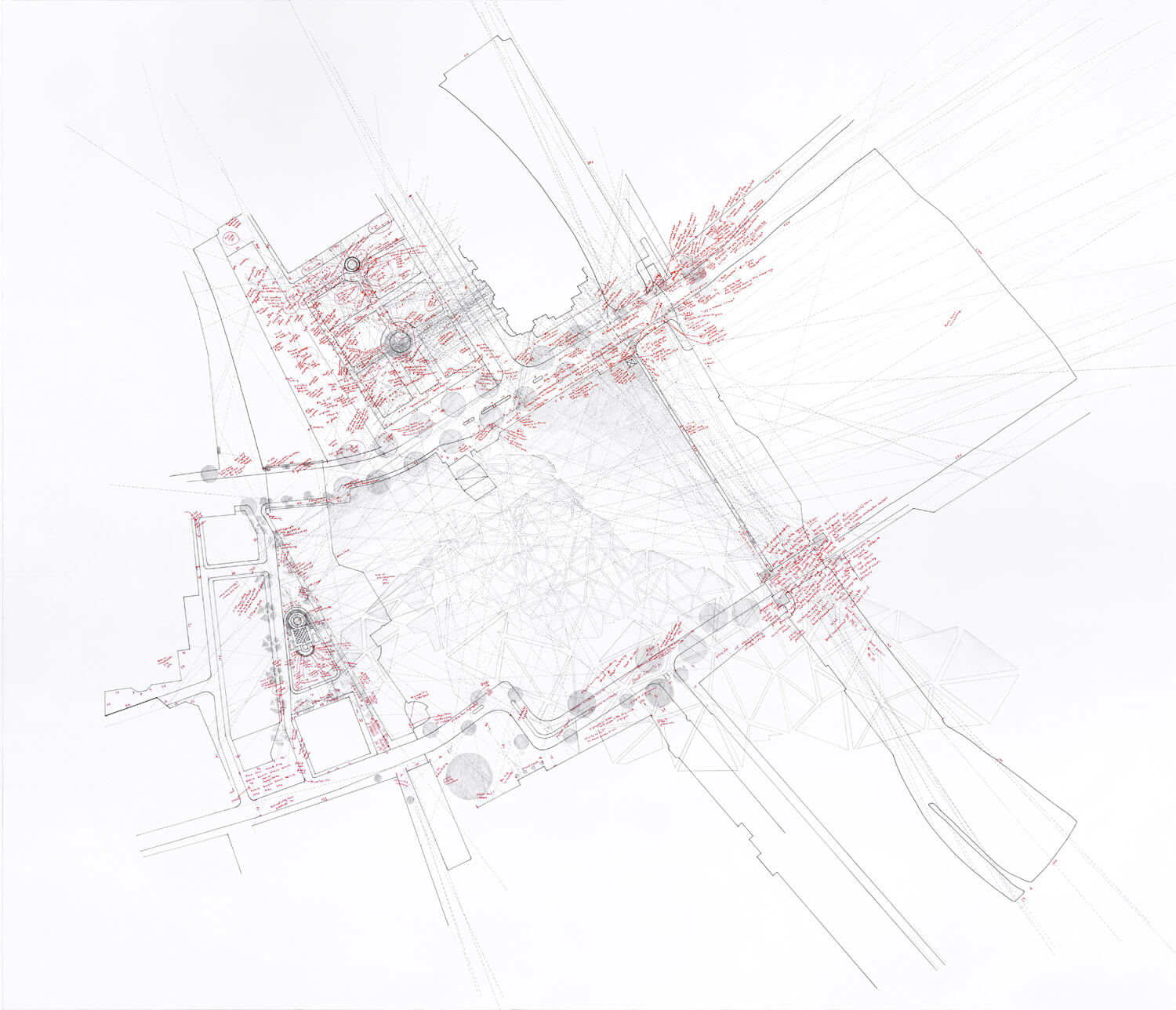 Over several months in 2013, Fassler returned to the site daily, recording movements, encounters, light, weather, minor dramas, and moments of unease or humour. Tourists, street scams, police interventions, stickers, shadows, and habitual paths were observed and noted. These fragments accumulate in drawings seen from a detached, planner’s bird’s-eye view, where documentation and composition merge.