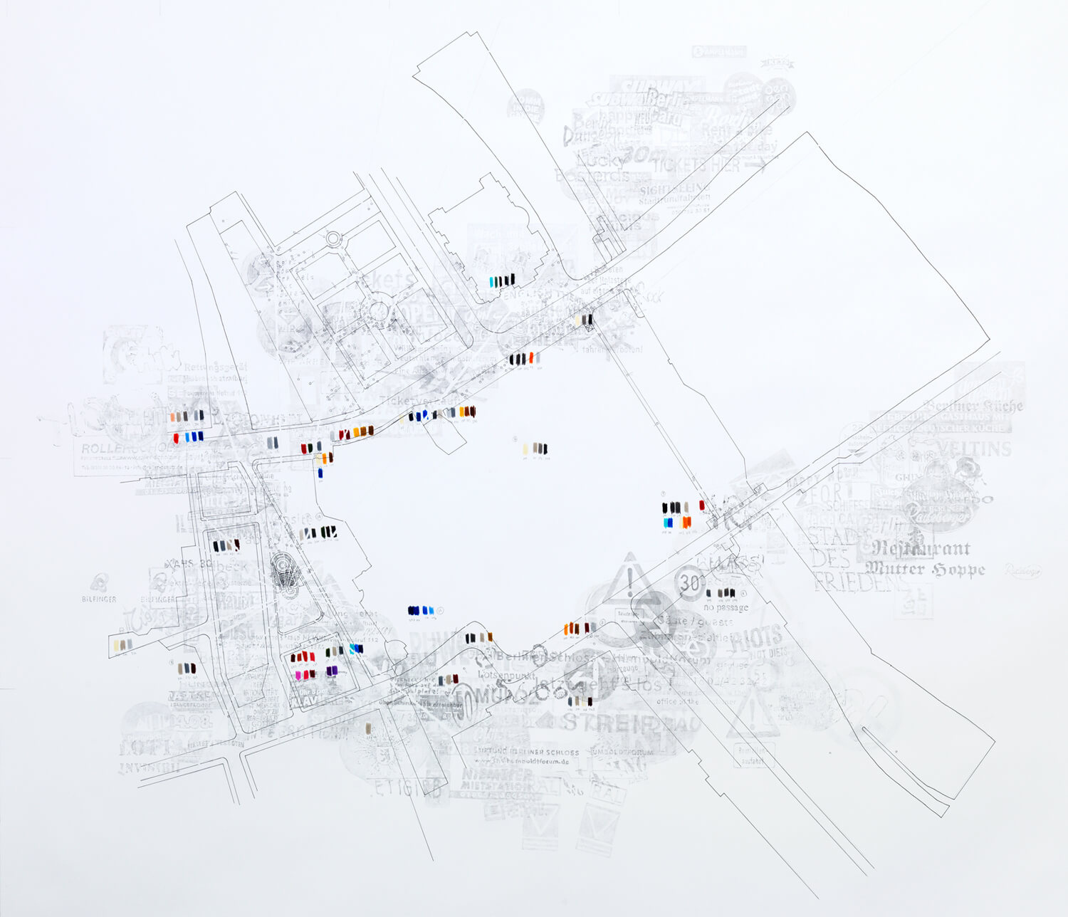 Over several months in 2013, Fassler returned to the site daily, recording movements, encounters, light, weather, minor dramas, and moments of unease or humour. Tourists, street scams, police interventions, stickers, shadows, and habitual paths were observed and noted. These fragments accumulate in drawings seen from a detached, planner’s bird’s-eye view, where documentation and composition merge.