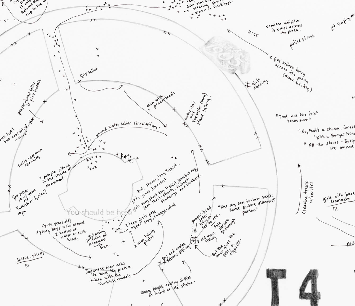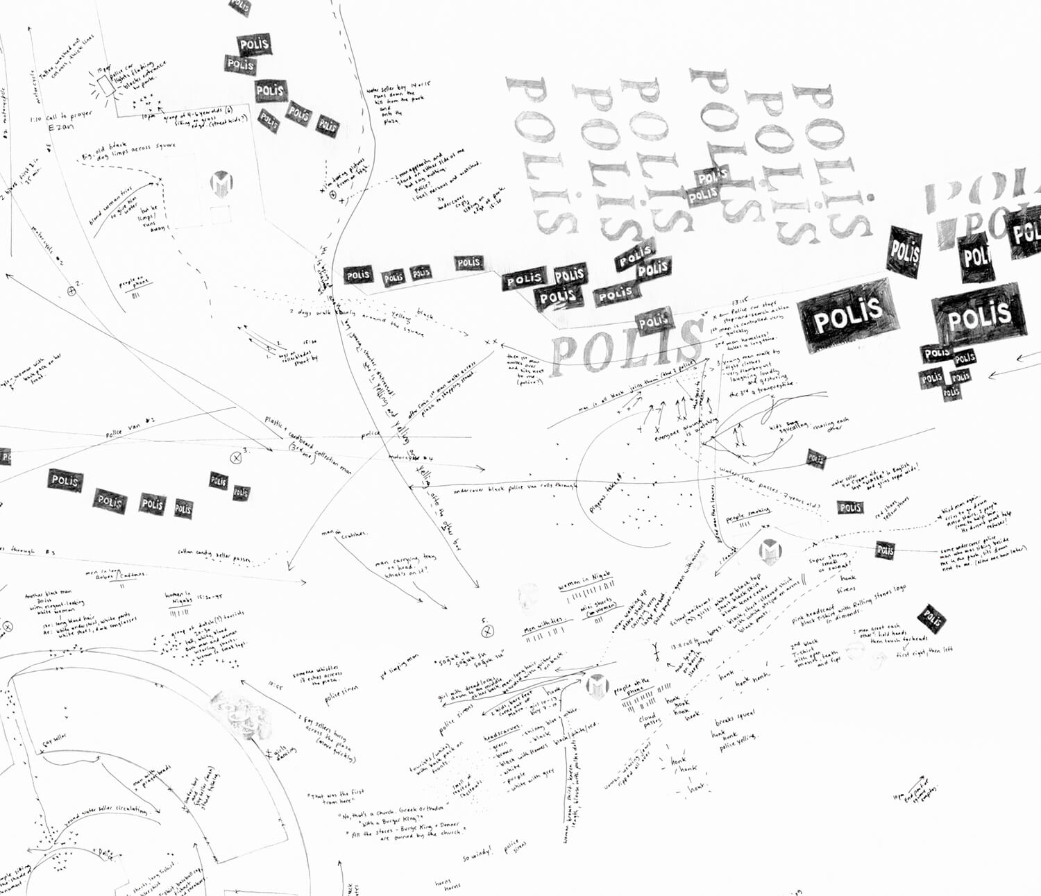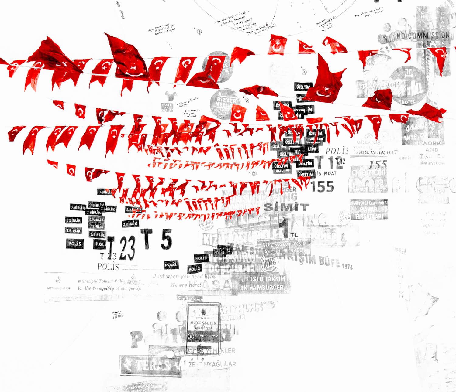 Under national flag bunting the mass of Istiklal street signs is visible alongside groupings of police and police vehicles (T4, T5, T12, T23, T155). Also documented is the amassing and removal of election campaign advertising, the presence of television journalists and news helicopters; and the daily movements and encounters between diverse constituents in the Square: tourists taking selfies, men drink çay, Syrian boys selling whirly-gigs and water, birdseed sellers tossing seeds, prostitutes giggling and chatting with passing men and Middle Eastern tourists dressed in niqabs.