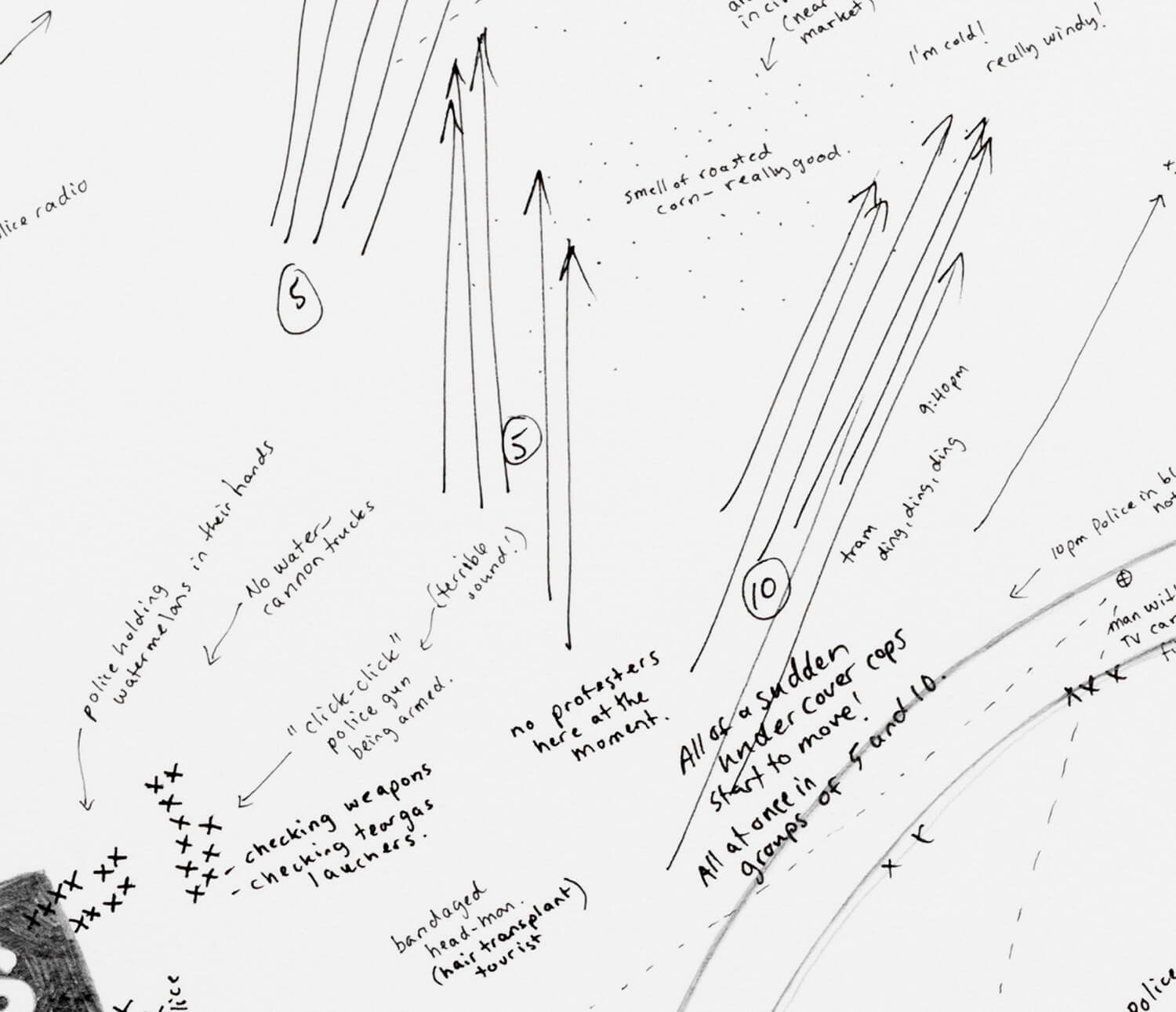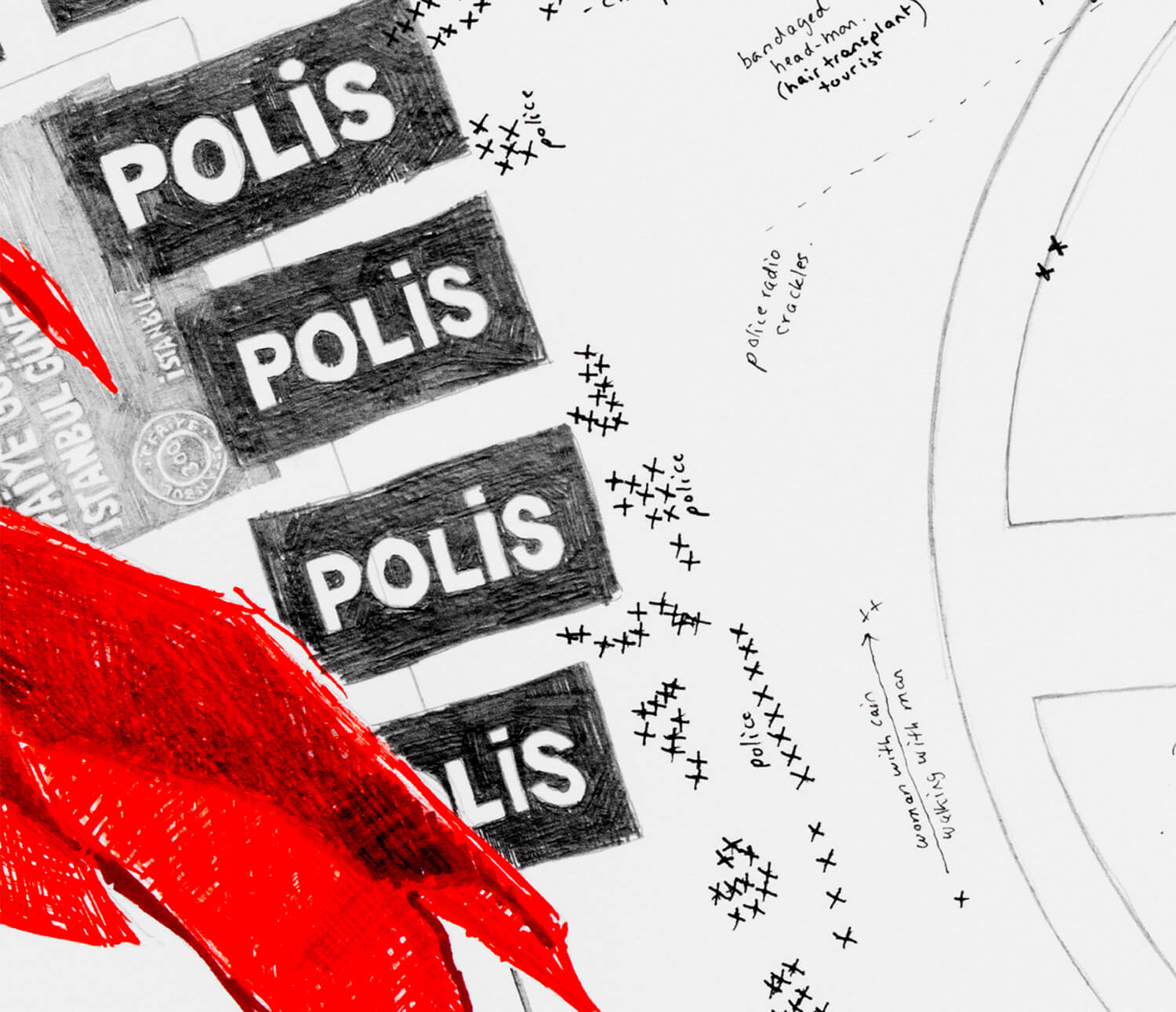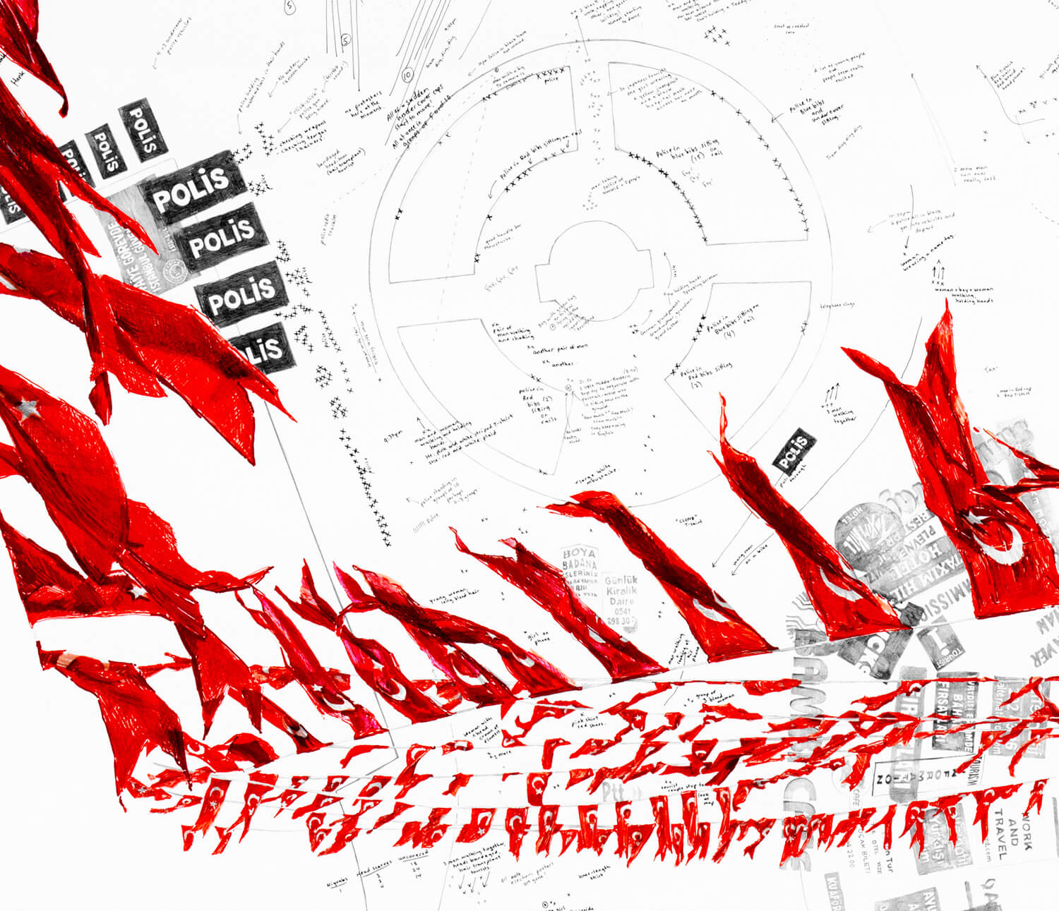 Presented in reverse chronological order (III, II, I) these three drawings look at Taksim Square, Istanbul over a period of 10 days; from the announcement of the 1st Turkish general election results (June 9) back to the evening of the second anniversary of the Gezi Park protests (May 31).